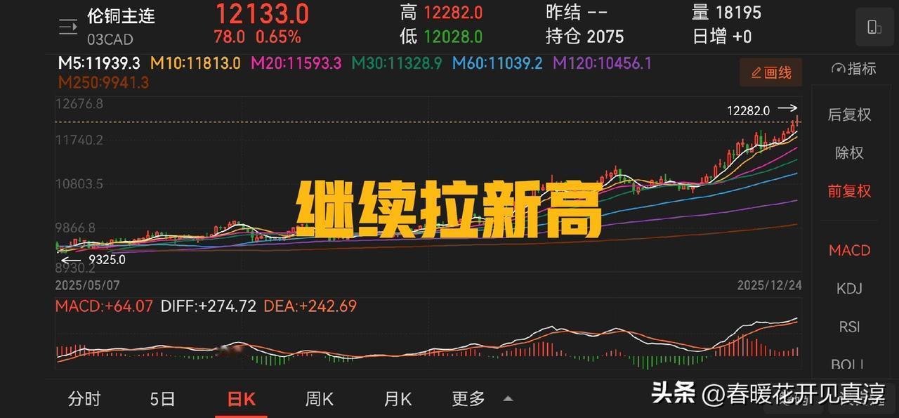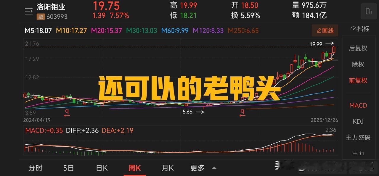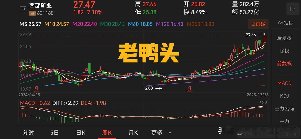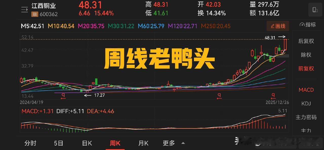 纽约铜和沪铜单日涨幅有点猛,不过,不要怕,也不要慌,从铜业股的周线图来看,多数走出了老鸭头的形态,江西铜业和西部矿业的形态相对好看一些。 洛阳钼业,紫金矿业也还可以,云南铜业、铜陵有色构建的形态就有点勉强,但是无论如何,这个态势还是非常好的。 所以对于和铜有关的投资,我觉得资本市场给出了自己的答案,就是坚定看多。2025 年马上就要过去了,目前的态势是让我非常开心的,因为他们终究将要证明自己。 昨天在分享的券商的帖子里,我说券商要点火,有网友说,就差你这盘菜了。嗯,或许吧。 情绪不会带来任何的资金收益,除非你去搞直播,作为互联网原住民,我可以接受这种韭菜的存在,同时也祝大家好运。