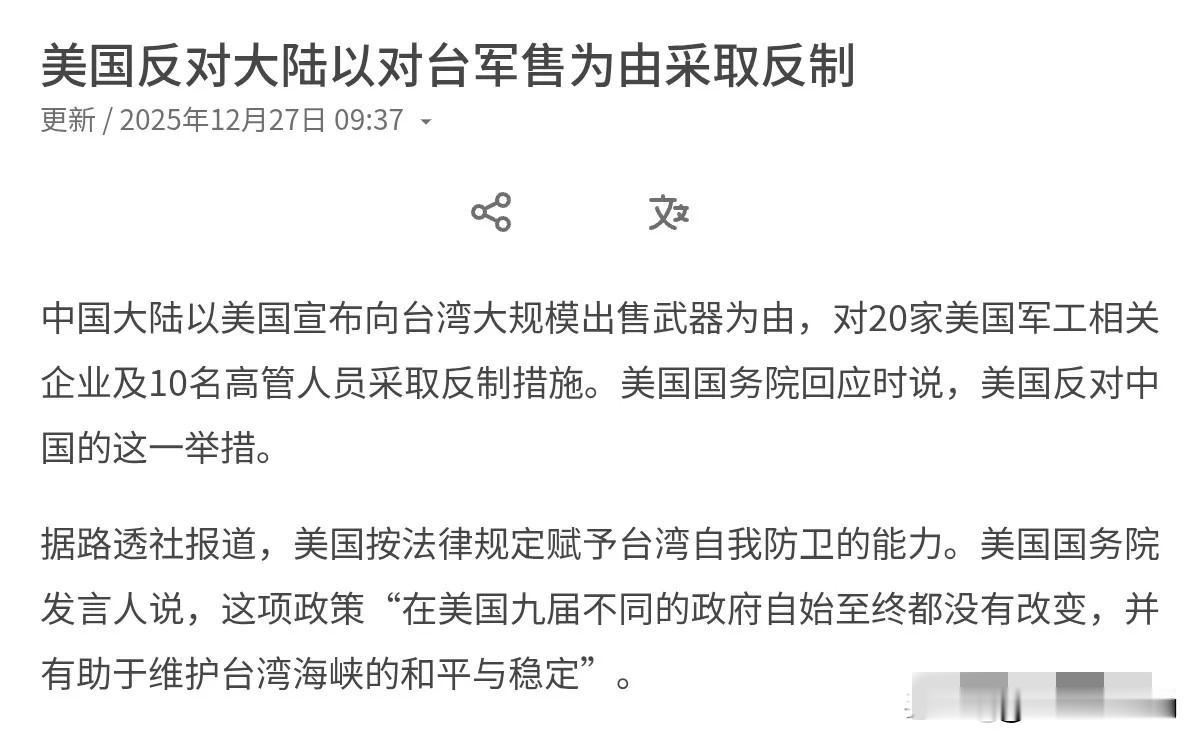 美国跳出来倒打一耙了!美国放话,坚决反对中国实施对美制裁!12月27日,在我们祭出制裁之后,美国国务院发言人表示,我们强烈反对北京方面针对支持美国对台军售、以增强台湾自我防卫能力的美国公司采取报复性措施。美国方面狡辩称,其一,美国的法律赋予了美国对台军售的权力。其二,美国认为此举有助于台海和平稳定。 评几句 美国此番"倒打一耙"堪称国际政治荒诞剧的巅峰之作。华盛顿一边践踏一个中国原则,公然对台军售破坏中国核心利益;一边又在中国依法反制时摆出受害者的可怜姿态。这种"我可以打你,但你不能还手"的强盗逻辑,将美式双重标准演绎得淋漓尽致。普赖斯口中的"法律授权"不过是美国国内法凌驾于国际法的霸权宣言,而"维护台海和平"更是赤裸裸的谎言——对台军售本身就是对台海和平的最大威胁。 美国国务院的抗议声明暴露了其根深蒂固的"规则破坏者"本质。当美国肆意制裁他国企业时,它高呼"基于规则的国际秩序";当中国依法反制美企损害中国主权的行为时,它却嚎叫"报复性措施"。这种"只许州官放火,不许百姓点灯"的傲慢,正是美式霸权走向衰落的生动注脚。华盛顿应该明白,中国早已不是那个任人宰割的晚清,任何损害中国核心利益的行径,都将面临坚决有力的反制。 美国在台海问题上的战略误判正在将中美关系推向危险边缘。华盛顿沉迷于"以台制华"的冷战思维,却低估了中国维护国家统一的钢铁意志。中国对美企的制裁不是"报复",而是依法行使国家主权的正当防卫。美国越是升级对台军售,就越会加速中国统一进程的历史车轮。当华盛顿还在幻想"维持现状"时,北京已经牢牢掌握了两岸关系的主导权。继续玩火者,必自焚于火。