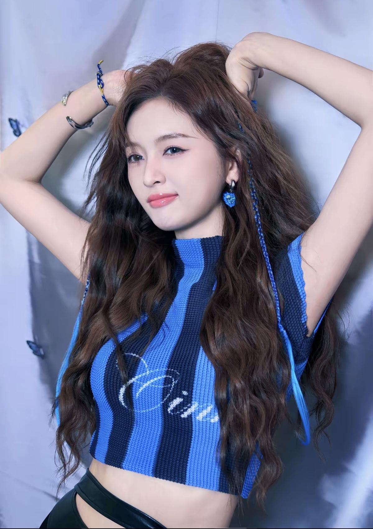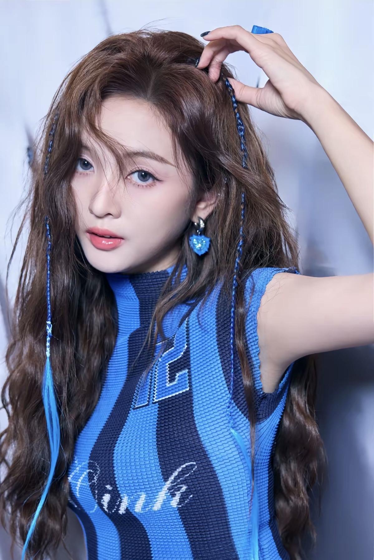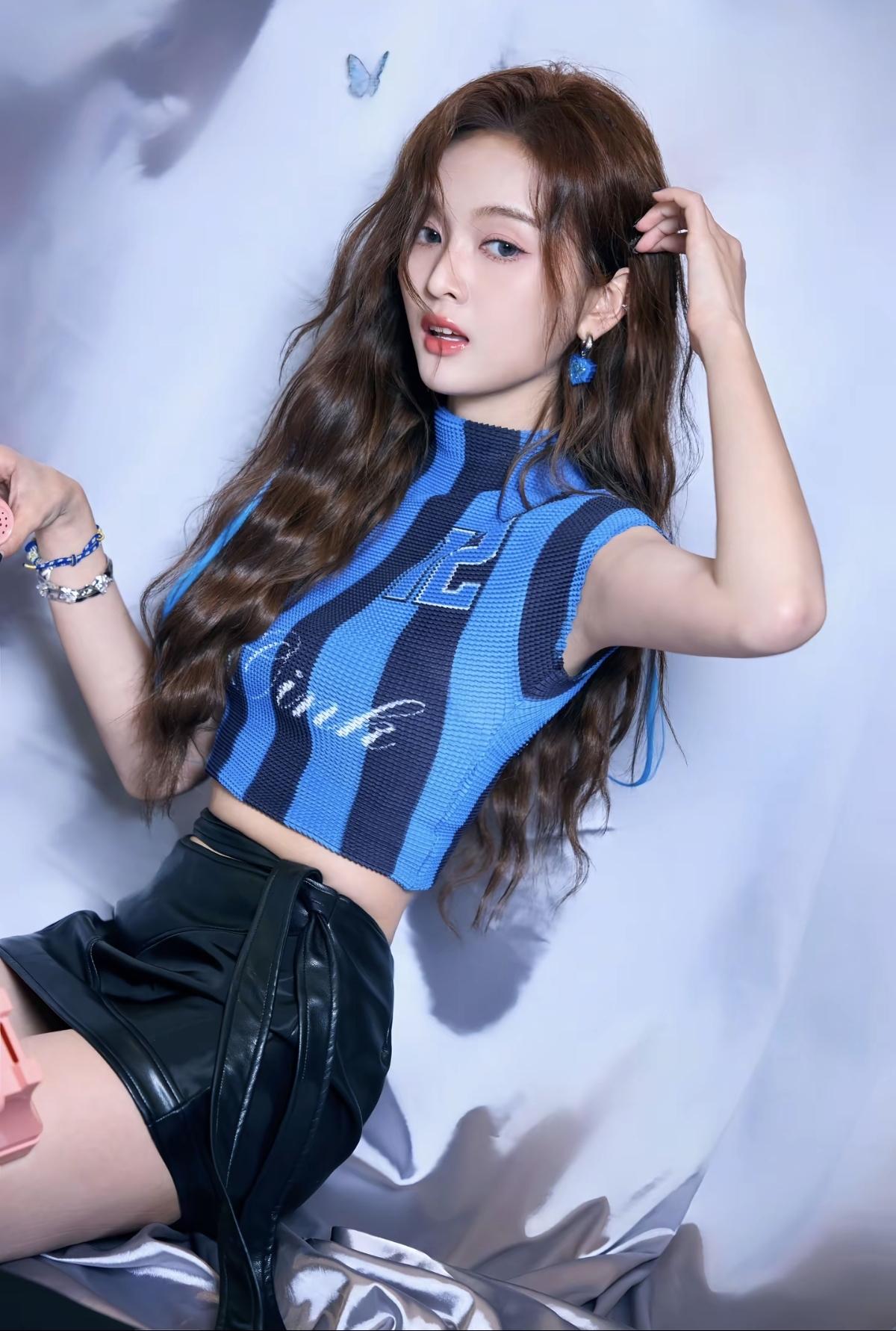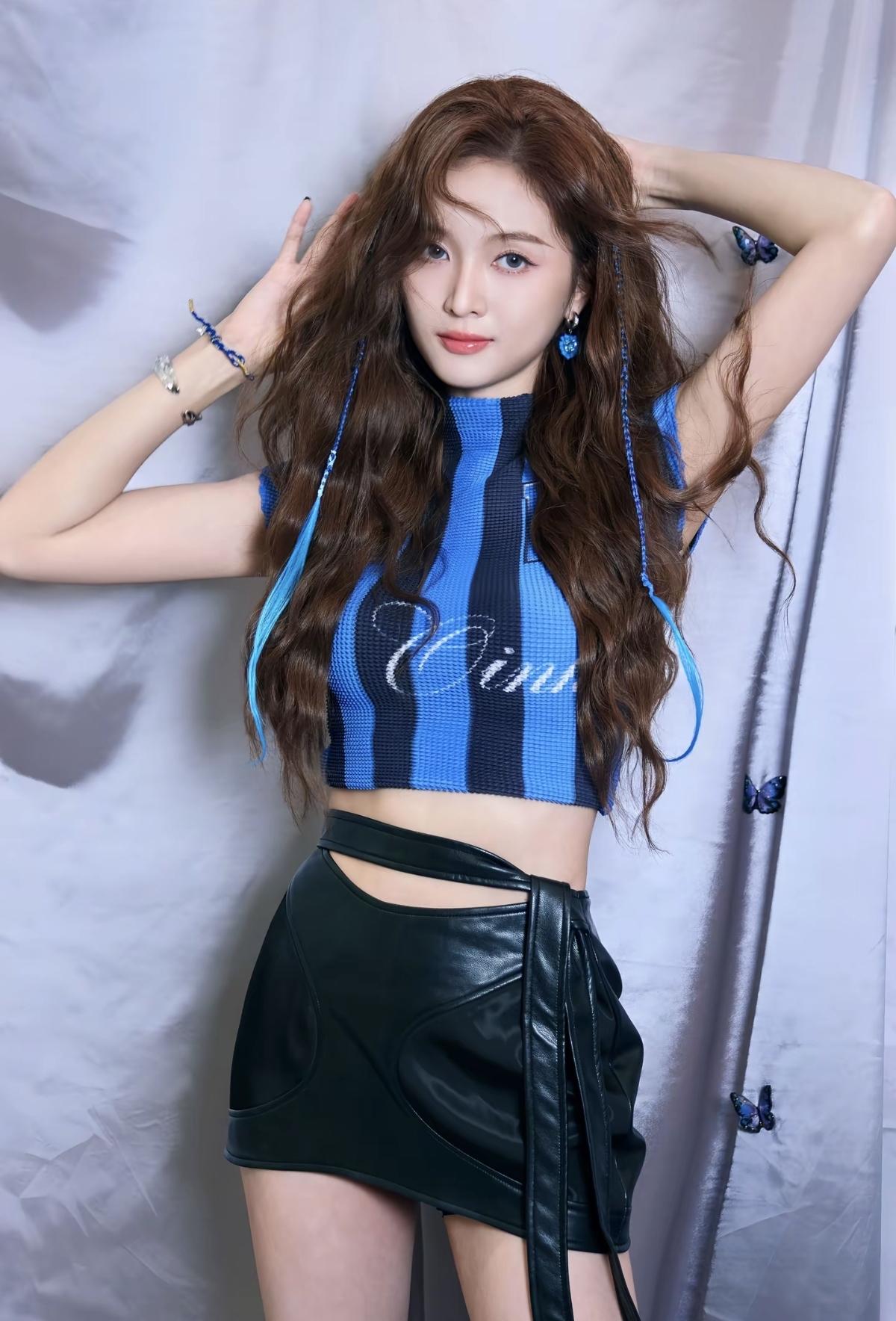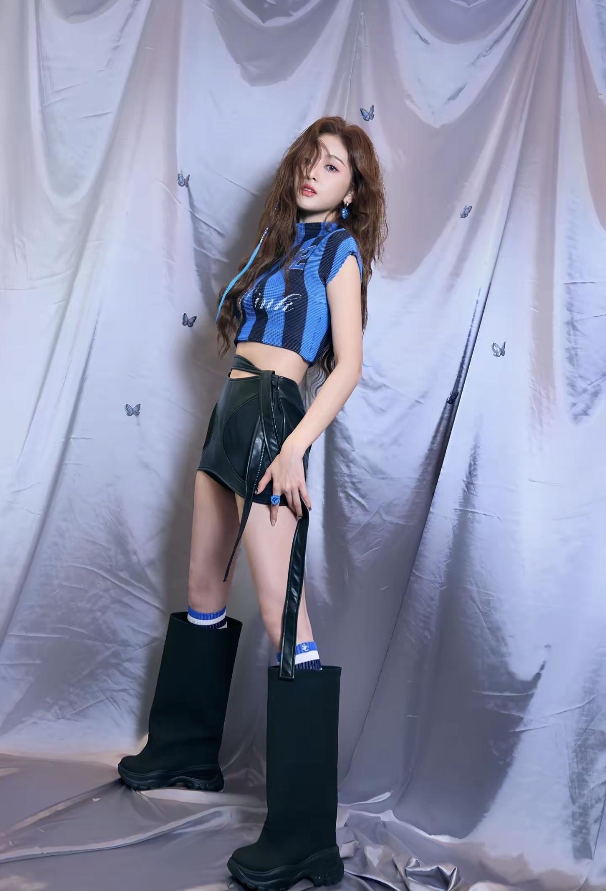 温柔与酷飒并存。蓝色针织短袖展现出宣仪的好身材,皮质短裙则注入了满满的时尚张力。