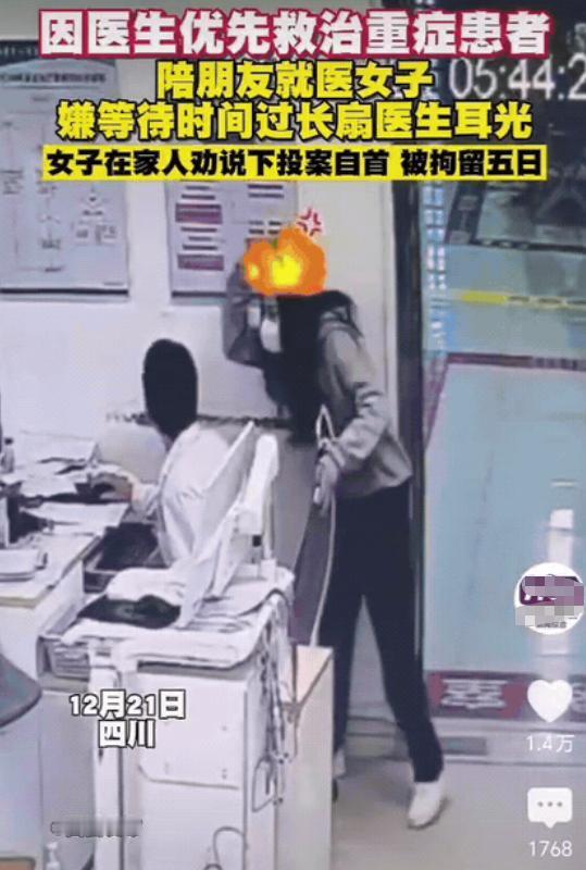 太冲动!四川西昌,一女子陪朋友到医院看病,结果挂号排队时发现医生先给重症病人诊治,女子很是愤怒,直接走到医生身后,给了医生一巴掌,然后肇事逃逸,结果如何? 事情发生在12月21日凌晨5点,正在睡觉的刁女士突然接到了朋友打来的电话,说身体不舒服,刁女士急忙赶了过去,发现朋友发烧了,就开车带朋友到了医院挂号。 因为是大早上,排队的人并不多,眼看着就要到刁女士朋友就诊,结果医生却先喊了后面的那个重症患者。 刁女士很是不满,不过还是忍了下来,毕竟朋友也没多说什么。 可一连等了十几分钟,医生还没有诊治完,刁女士再也忍不住了,直接走到了医生的后面,给了医生一巴掌,医生还没反应过来,等他回头的时候,发现刁女士已经不见了踪影,医生随即报警处理。 而在另一边,刁女士回到家里之后将这件事讲给了家人,在她看来这件事就是医生的错,如果都可以插队,那还要挂号干什么。 不过,刁女士的家人一听她居然打了医生之后可是吓坏了,连忙劝说她主动到派出所自首,还说不管再怎么样都不该打人,刁女士的朋友也觉得这样不对。 就这样,在家人的劝说下,刁女士当天中午还是到了派出所说明了情况,并且表示愿意向那位值班医生道歉。 值班医生解释说当时是看到后面排队的那个患者病情严重,为了救人,这才选择先给对方看,自己也有做的不好的地方,对刁女士表示了谅解。 而根据治安管理处罚法规定,刁女士殴打他人的行为性质恶劣,警方随即依法对其处以5天拘留,刁女士也为自己的冲动付出了代价。 这件事传到网上之后,不少人支持刁女士,认为她是按规定挂的号,后面的病人就不该插队,即便插队医生也该提前讲清楚才是。 只是,如果从重症患者的角度来看,医生的做法似乎又并无不妥,因为医生以救死扶伤为天职,如果能早一秒诊治,那就会多一份希望。 只能说,双方还是缺乏必要的沟通,很多时候,多解释一句问题也许就迎刃而解了。 对此,大家又是怎么看的呢?