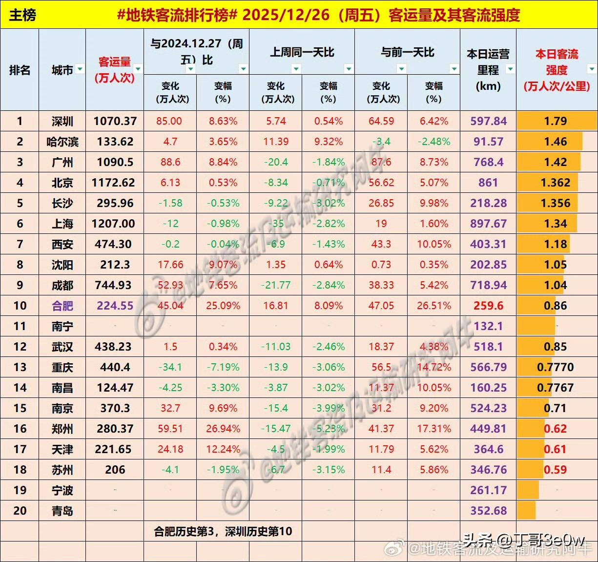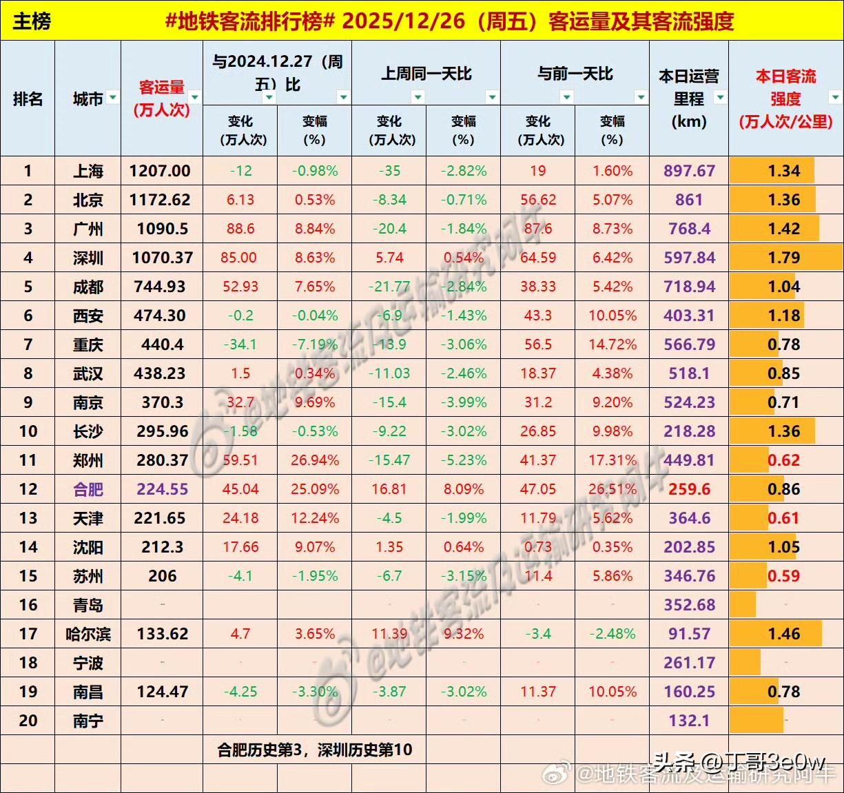 合肥地铁客流量达224万人次以上,创历史第三名[呲牙][呲牙][呲牙] 爆料 身边事 合肥地铁 地铁客流排行榜 中国地铁客流日报 昨日客流 周五 2025年12月26日 星期⑤ 全国重点城市轨道交通客流量排行榜: 上海:1207.00万 北京:1172.62万 广州:1090.50万广州地铁 深圳:1070.37万深圳地铁 成都:749.13万 西安:474.30万西安爆料 重庆:440.40万重庆身边事 武汉:438.23万 南京:370.30万南京地铁 长沙:295.96万长沙身边事 郑州:280.37万郑州爆料 合肥:224.55万 天津:221.65万天津地铁 沈阳:212.30万沈阳地铁 苏州:206.00万 青岛:130万+青岛爆料 哈尔滨:133.62万 宁波:110万+宁波地铁 南昌:124.47万江西南昌身边事 南宁:100万+