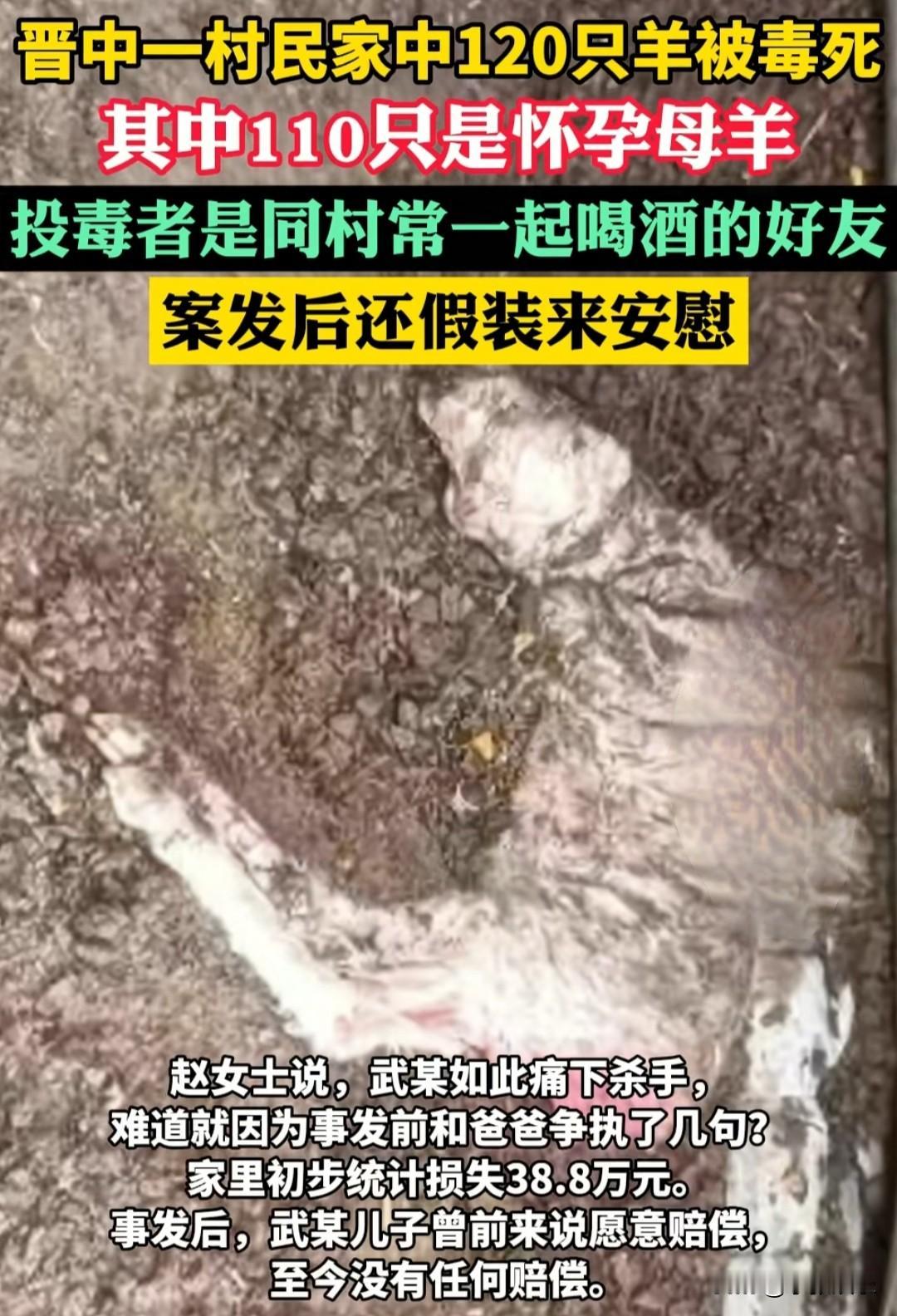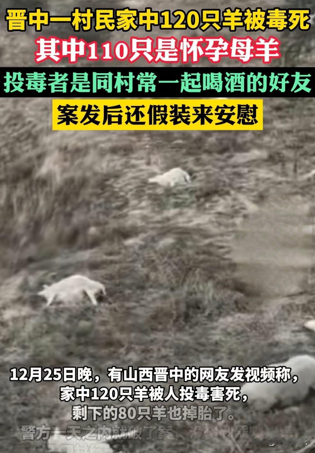 “嫉妒使人面目全非”,晋中农村的野地里,躺了一地的死羊,白花花的一片,好些母羊的肚子还鼓着,里面的小羊羔也跟着没了气。 养殖户赵某蹲在旁边,哭得直捶大腿——他咋也想不到,把他这群羊毒死的,不是外人,就是跟他天天凑一块儿喝酒的同村武某! 这事就发生在12月25号晚上,赵某去羊圈喂料,刚一进门就瞅见不对劲:一群羊躺在地上抽抽,口吐白沫,没一会儿就不动弹了。 他赶紧数,整整120只羊都死了,其中110只还是怀了崽的母羊,这一下等于没了两百多条命啊!剩下的80只羊虽说没死,可也全都掉了胎,肚子里的小羊羔全保不住了。 赵某当时就报了警,警察来一查,发现羊的饲料和水里被人下了毒,明摆着是有人故意使坏。 这时候,同村的武某倒挺“热心”,拎着水果牛奶就来了,拍着赵某的背说“老哥你别难过,肯定是外人干的,警察一准能抓住”,还帮着赵某抬死羊、清理羊圈,忙前忙后跟真的一样。 谁知道警察一天就把案子破了,抓的就是这个假惺惺的武某!原来武某早就眼红赵某养羊挣了钱,看人家日子越过越红火,自己心里不舒服,就起了坏心眼。 夜里趁赵某睡着了,偷偷跑到羊圈里撒了毒药,以为没人能发现,还装成好人来安慰,想蒙混过关。被警察问的时候,武某也没藏着,直接承认就是“见不得他比我过得好”。 现在武某已经被警察扣下了,等着他的肯定是法律的收拾。可赵某这边惨了,120只羊没了,80只羊也废了,光赔钱就赔了几十万,半辈子的心血全打了水漂。村里的人知道了都骂武某:“就因为眼红,干出这种缺德事,几十年的交情全喂了狗!” 说白了,邻里之间处得好好的,哪能因为人家过得好就使坏?武某这一闹,不光毁了赵某的生计,自己也得蹲大牢,图啥呢?这事儿也给大伙提个醒,别让心里的嫉妒害了别人,也毁了自己。