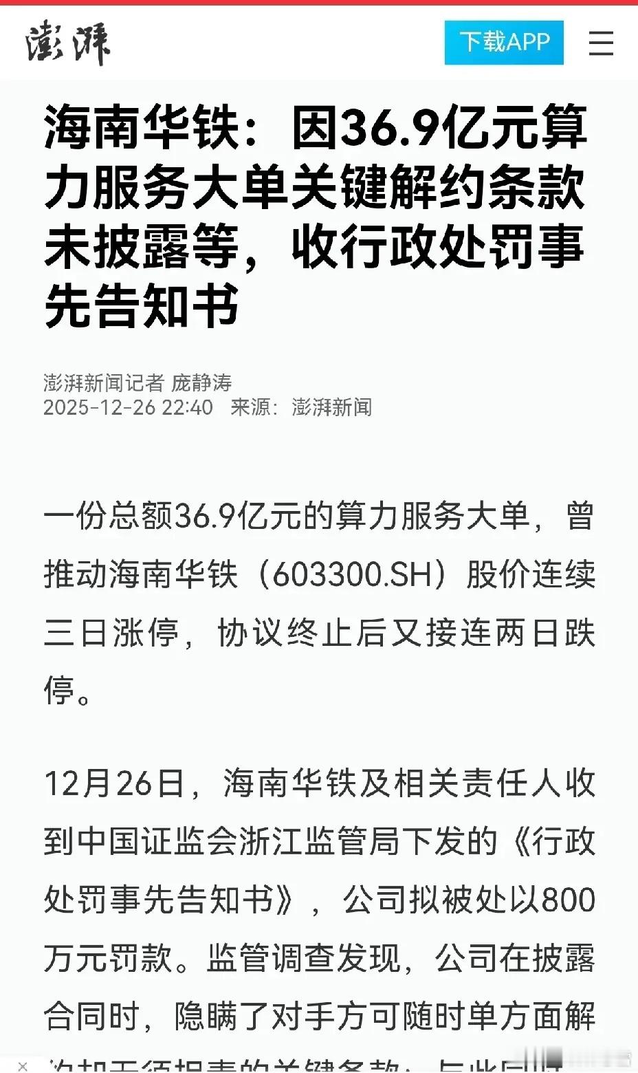 海南华铁这波“算力乌龙”,最后受伤的,往往还是普通投资者。36.9亿算力服务大单先是点燃市场情绪,股价冲高到13.27元,随后协议终止、股价腰斩至6.66元,如今800万行政处罚落地,一涨一跌之间,多少人从“赚到”变成“被套”,只有当事人自己最清楚。别人是股价涨了赶紧澄清传闻,它却是用一份被终止的协议把市场先拉后砸,最后一地鸡毛。公司被处罚冤不冤,留给监管和时间去评说,但散户的真金白银,从来经不起这样的试错。只希望类似的故事少一点,市场能多一点真诚,少一点“乌龙”。