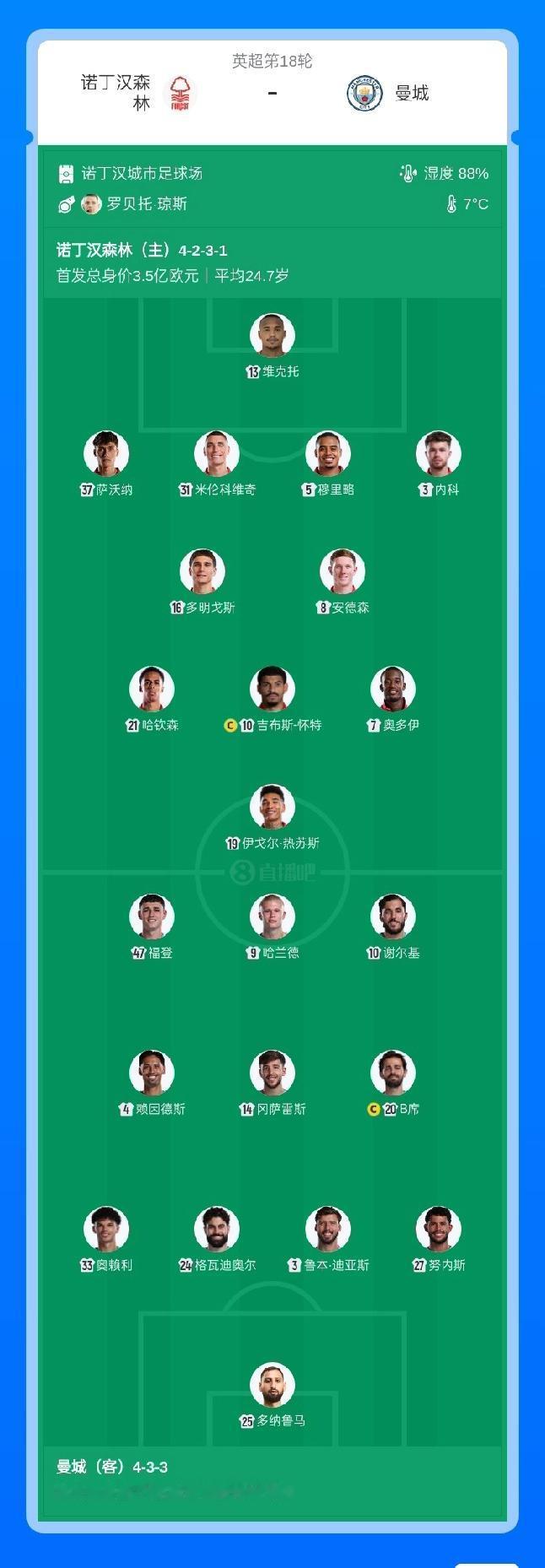 英超 曼城客战诺丁汉森林首发:哈兰德、福登领衔,谢尔基、赖因德斯先发,罗德里伤愈替补 12月27日20点30分,英超第18轮,诺丁汉森林主场迎战曼城,赛前双方首发公布。曼城方面:哈兰德、福登领衔,谢尔基、赖因德斯、尼科·冈萨雷斯先发,罗德里伤愈替补