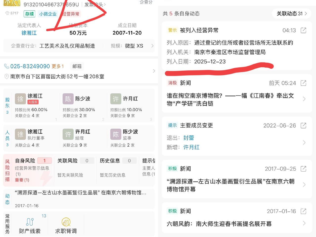 好家伙,不会是早有预谋吧! 这跑路速度简直绝了,比变脸还快!前脚南京博物院原院长徐湖平刚被查,后脚儿子徐湘江的“敏求艺术”立马唱了出空城计。秦淮区那边一上门,嚯,大门紧闭,人影全无,直接被列入经营异常。 这明显就不像正经做生意的,以前老爹在位,儿子的“艺术品”不愁卖。大家心里都明白,牵扯太深结局好不了。现在老爹这靠山倒了,窗户纸一捅破,所谓的雅致生意,全是偷窃。现在连夜搬空,没亏心事能这么干吗!这父子俩把“父荣子贵、父败子逃”展现得挺明白,或者老爷子觉得年龄大了无所谓了,多扛点罪,让儿子跑远点,找人求救去? 大家说他能跑得了吗? 你们说,这种现象咋就屡见不鲜呢?