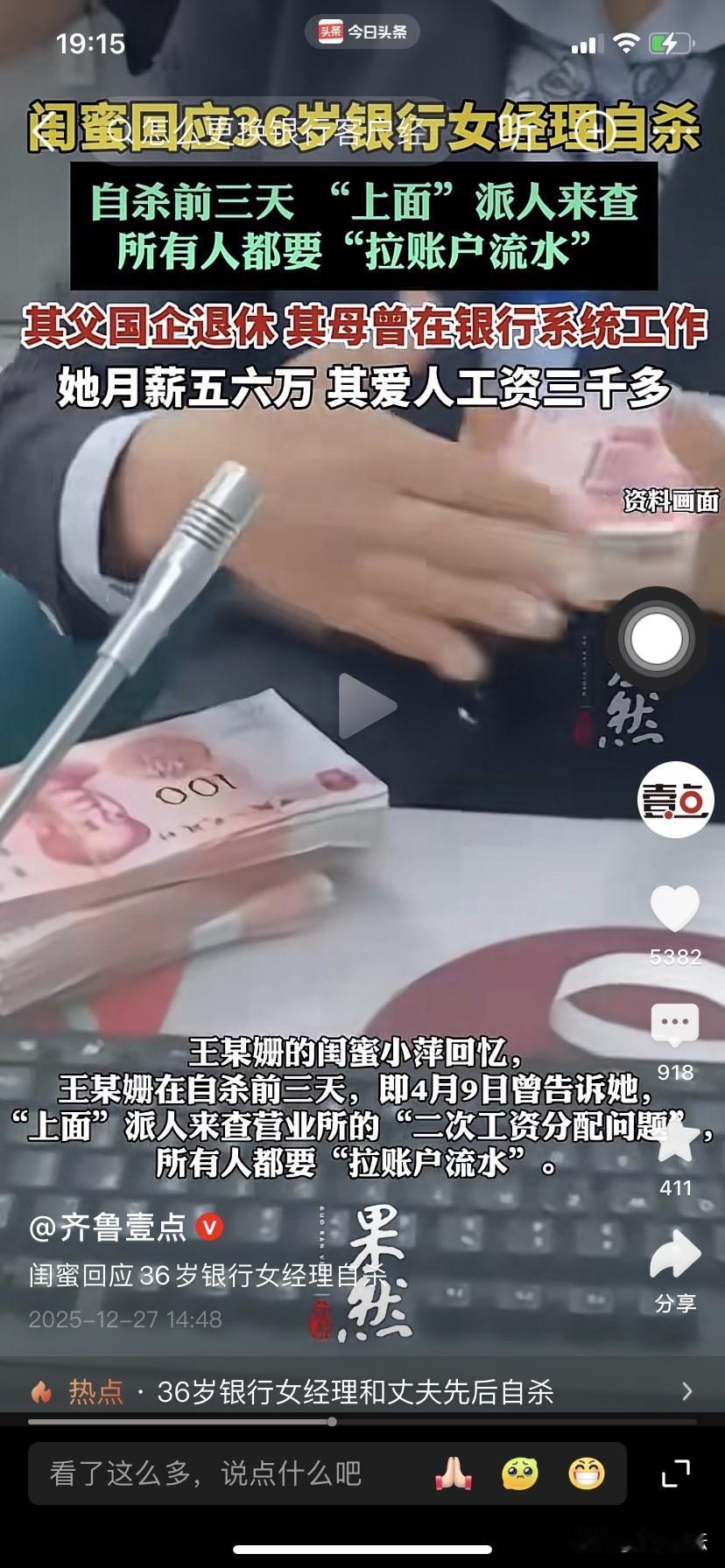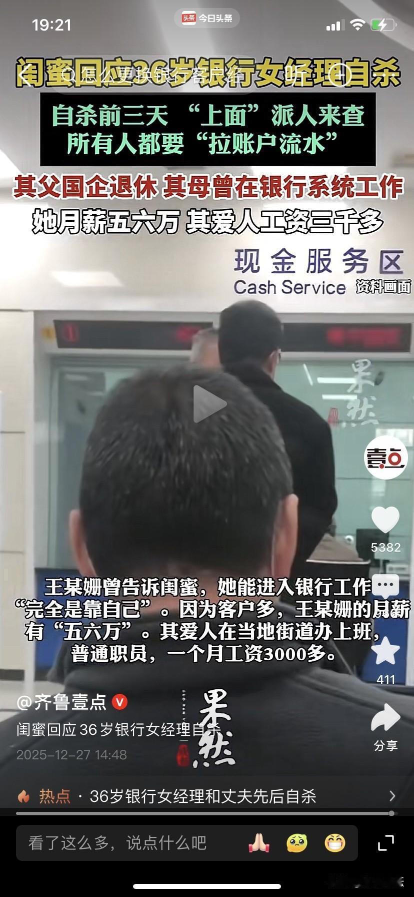 银行理财女经理和丈夫先后自杀。 2025年4月12日,36岁的银行理财经理王某珊被发现在家中自杀,其丈夫也不明原因自杀,家里留下两个年幼的孩子。 据悉,王某珊的父亲是某国企退休职工,母亲曾在银行系统工作,王某珊在银行担任理财经理,由于客户多业绩好,月薪已过万,其丈夫在街道工作月薪¥3000。生前转走多名储户1000多万元。王某珊在商丘家中自杀后,他服务过的多名客户发现自己的财富从银行卡中消失。 据王某珊的闺蜜透露:王某珊自杀前三天(4月9号)曾告诉过她,上面已经派人来查二次工资分配问题,所有人都要拉账号流水。自杀原因疑似挥霍多名储户财富无法兑现而畏罪自杀。 王某珊在银行工作月薪过万,她的收入已经超过90%的普通人,夫妻俩本应生活的很好,但因王某珊贪婪挪用储户的钱,最后越陷越深陷入无法收拾的泥潭而走向绝路。只可惜留下两个未成年的孩子,还需要留给老人照料。[祈祷][祈祷]