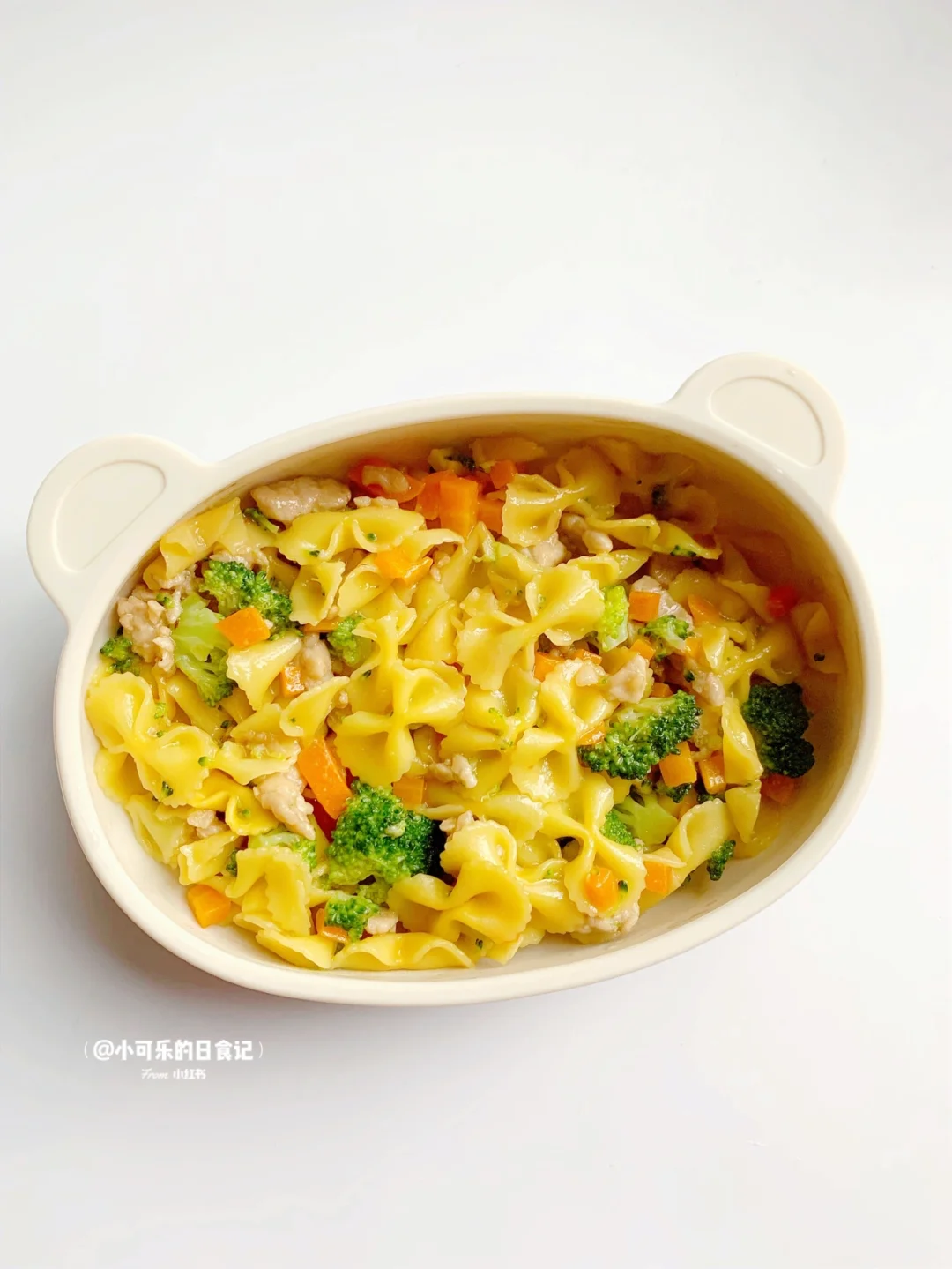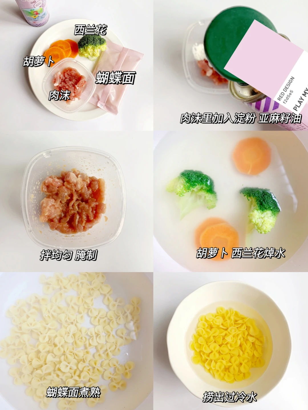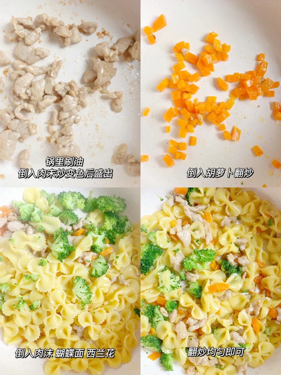 3⃣️锅里刷油,倒入肉沫翻炒变色,盛出。倒入胡萝卜翻炒,倒入肉沫 蝴蝶面 西兰花翻炒均匀即可