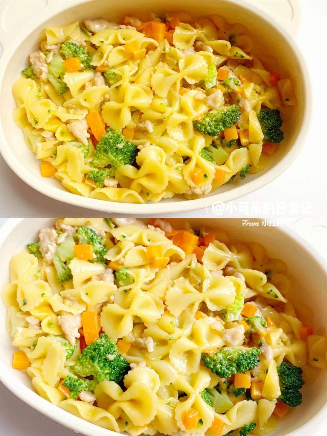 2⃣️胡萝卜和西兰花焯水切碎,蝴蝶面煮熟捞出过冷水