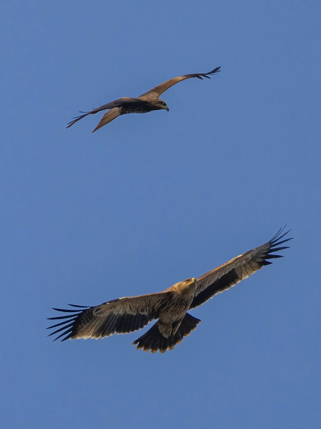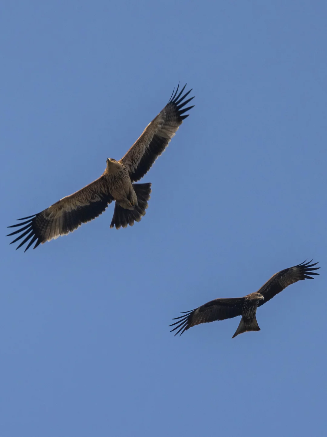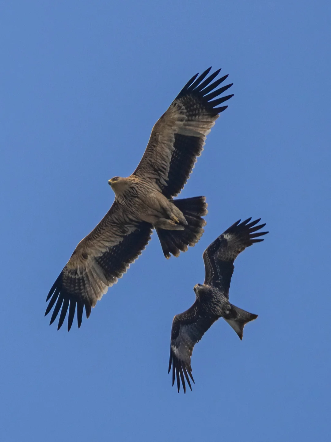 若干只黑鸢大战白肩雕!黑鸢的胆子也挺大的,真下黑手,可能趁数量多,毕竟在上个月还有鸟友看到这只白肩雕吃一只黑鸢。另外还有一只成年的白肩雕,不堪其扰,往另外方向飞远了,拍到一个远远的像素版。