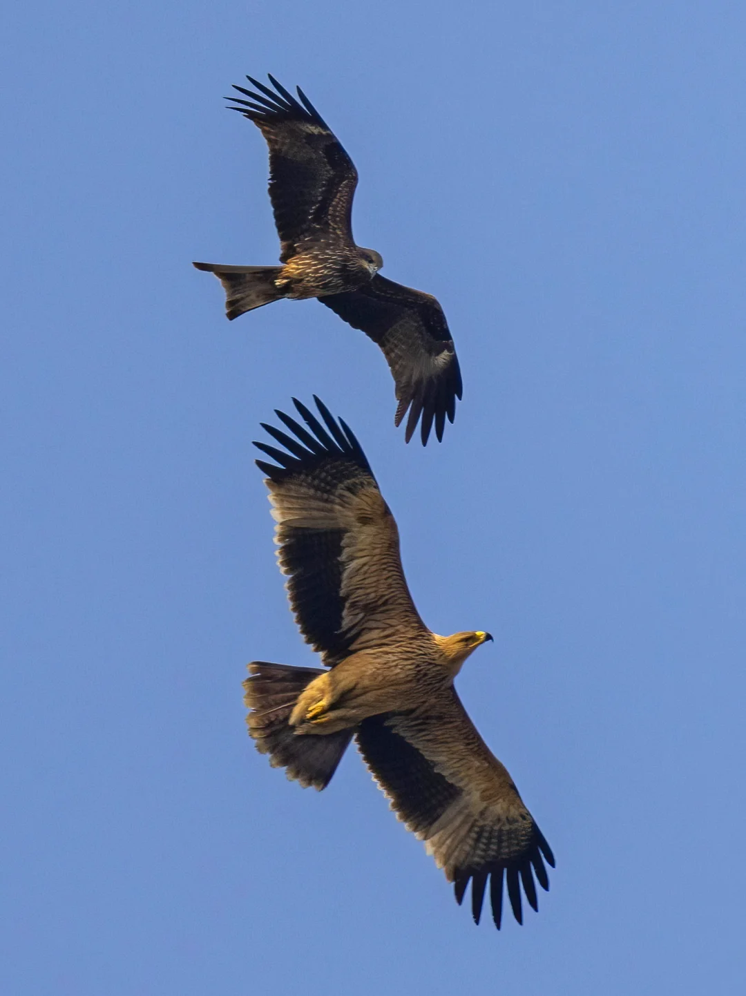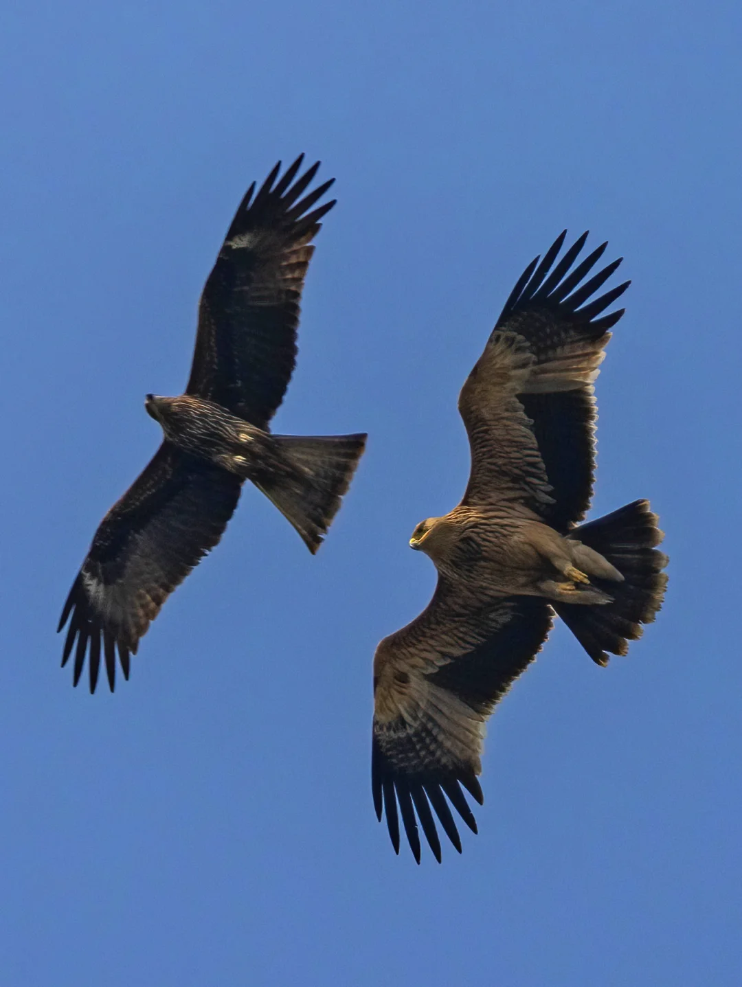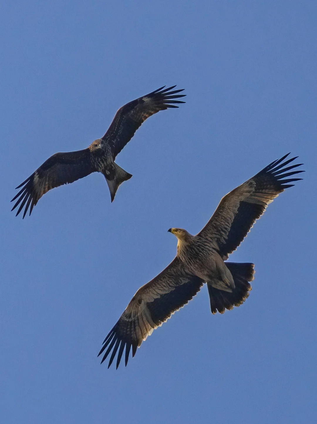 若干只黑鸢大战白肩雕!黑鸢的胆子也挺大的,真下黑手,可能趁数量多,毕竟在上个月还有鸟友看到这只白肩雕吃一只黑鸢。另外还有一只成年的白肩雕,不堪其扰,往另外方向飞远了,拍到一个远远的像素版。