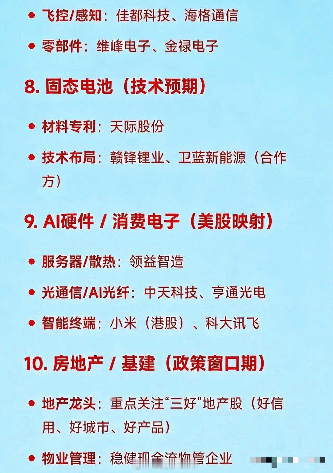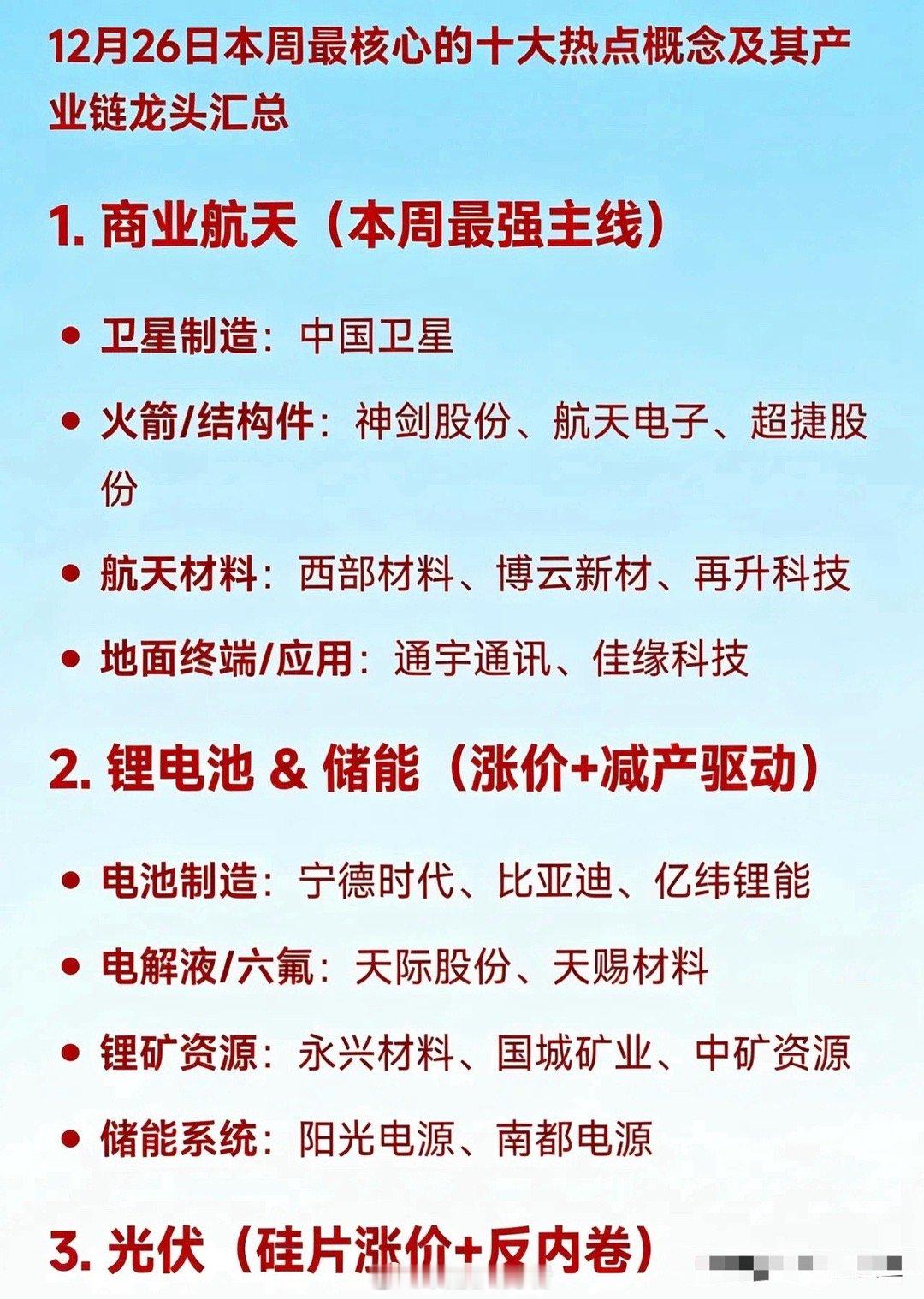 12月27日,本周市场热点概念呈现多线活跃态势,以下为核心的十大热点概念及其产业链龙头汇总:1. 商业航天(本周最强主线)卫星制造领域以中国卫星为核心龙头;火箭及结构件方面,神剑股份、航天电子、超捷股份表现突出;航天材料领域,西部材料、博云新材、再升科技占据重要地位;地面终端及应用环节,通宇通讯、佳缘科技展现出较强竞争力。2. 锂电池 & 储能(受涨价与减产因素驱动)电池制造龙头包括宁德时代、比亚迪、亿纬锂能;电解液及六氟领域,天际股份、天赐材料表现亮眼;锂矿资源企业中,永兴材料、国城矿业、中矿资源备受关注;储能系统方面,阳光电源、南都电源是核心代表。3. 光伏(硅片涨价叠加反内卷效应)硅料及硅片环节,通威股份、TCL中环、隆基绿能引领行业;组件与电池领域,晶科能源、钧达股份、天合光能表现突出;逆变器环节,阳光电源、锦浪科技持续发力。4. 人形机器人(并购动态与技术突破推动)整机及平台领域,优必选拟入主锋龙股份引发关注;减速器环节,绿的谐波、双环传动占据优势;伺服与关节领域,昊志机电、兆威机电表现活跃;控制系统方面,汇川技术是核心龙头。5. 海南自贸港(全岛封关启动带来机遇)免税零售领域,中国中免、海汽集团为主要代表;本地基建及物流环节,海南发展、海峡股份、龙建股份受到关注。6. 半导体 / 光刻机光刻整机领域,上海微电子是核心;配套及载体环节,张江高科、赛微电子、茂莱光学表现突出;芯片制造方面,中芯国际地位显著;存储芯片领域,德明利备受关注。7. 低空经济(政策与金融支持加持)运营服务环节,中信海直表现亮眼;飞控及感知领域,佳都科技、海格通信占据重要地位;零部件环节,维峰电子、金禄电子展现出较强竞争力。8. 固态电池(技术预期推动)材料专利领域,天际股份表现突出;技术布局方面,赣锋锂业及合作方卫蓝新能源受到关注。9. AI硬件 / 消费电子(受美股映射影响)服务器及散热环节,领益智造表现活跃;光通信及AI光纤领域,中天科技、亨通光电是核心;智能终端方面,港股小米、科大讯飞受到关注。10. 房地产 / 基建(政策窗口期)地产龙头中,重点关注具备“好信用、好城市、好产品”的“三好”地产企业;物业管理领域,拥有稳健现金流的物管企业更受青睐。