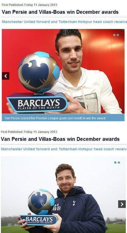 【范佩西当选英超12月最佳球员】1月11日晚,英超官方公布12月最佳球员和最佳教练,曼联前锋范佩西和热刺主帅博阿斯分别当选。范佩西12月份打进5球,上演两次绝杀,率领曼联取得5胜1平的战绩。13日晚与利物浦的双红会,范佩西与苏亚雷斯的最佳射手之争谁会进球呢!英超