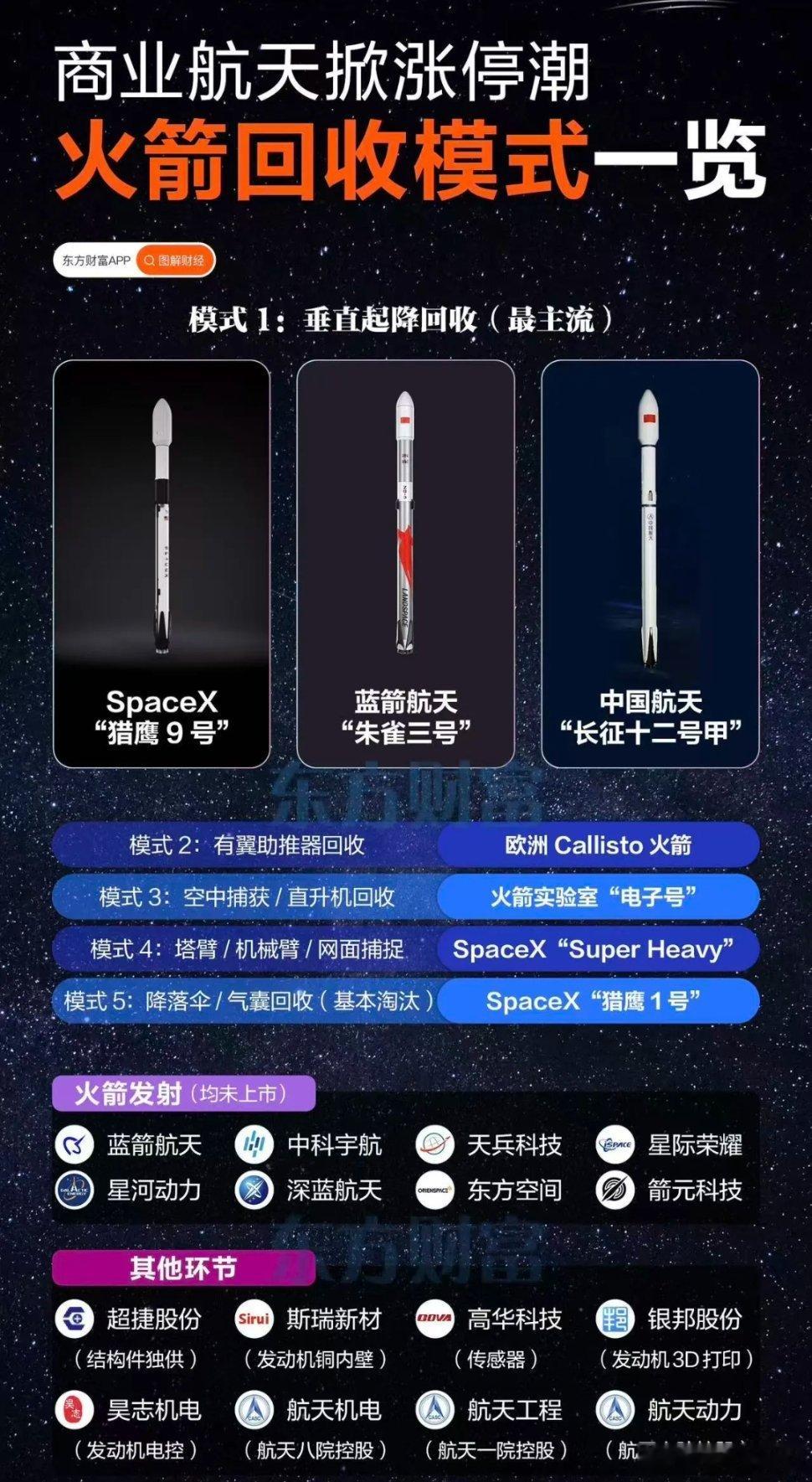 商业航天掀涨停潮 火箭回收8家公司,其中一家重点关注【火箭回收概念股梳理】商业航天本周高潮,走强的分支就是 火箭回收方向,主要原因就是 火箭回收 朱雀三号长征12甲的回收都出现了问题,那么接下来火箭回收的试验 还会密集的到来上交所发布了关于商业火箭的科创板符合第五套上市标准的 细则,这就是已经很明显了,明年要与 speax来进行竞争,接下来会为 火箭回收类的公司开绿灯 加速IPO目前国内火箭回收类公司 还未上市 (加速IPO中) 蓝箭航天 星河动力中科宇航 深蓝航天天兵科技 东方空间星际荣耀 箭元科技科创板细则明确强调符合火箭回收技术 作为上市的一个标准,这八家都是这个方向,目前重点是蓝箭航天 虽然朱雀三号的回收失败了,但是在2026年依然还是会继续在测试而且蓝箭航天 完成了上市辅导 目前按照进度来说 比沐曦的上市流程还要快,可以预见的是 蓝箭航天 大概率会在2026年上半年首发过会。 剩下的七家也会加速进行。所以火箭回收 也就是火箭重复利用方向 2026年依然是很大的空间发展。这八家的持股方和相关产业链 大家重点关注 觉得有用点赞关注a股A股