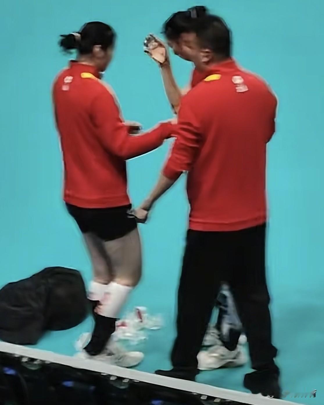 原来吴梦洁昨天离场的时候,无法走路,两位队友搀扶着一瘸一拐走出比赛馆的!躺在地上的小吴同学,三名教练过来给她治疗,有给她敷冰块的,有给她送右腿护具的,还有给她喂水喝的!吴梦洁她真的是一位敬业的优秀主攻手,希望教练好好珍惜她啊,明年在天津举办的女排亚锦赛(冠军直通洛杉矶奥运会)吴梦洁可是国家队的顶梁柱,可不敢再次受伤了!