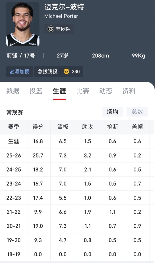 我对小波特的交易持保守态度 首先我认为在鱼腩球队打出的数据并不能代表一个球员在季后赛球队的真实水平,图1-图3都是一些典型案例,三人里面除了老黄忠在约基奇身边虽然降产但是效率上去了,做好了3D的职责之外,其他两位不管是从面板数据还是赛场表现上来看都是失败的引援,也许小波特跟他们唯一不一样的就是23赛季以首发主力身份拿了冠军吧,但是个人对他的季后赛稳定性存疑 其次再看一下图4-图9,小波特基本上能在每个常规赛都稳定输出,但如果真的来到勇士那肯定会降产,参考在掘金约基奇在的情况下场均18分左右,在勇士估计也不会高多少。况且能否适应勇士也是要等打了才能清楚的,去年在篮网场均18分的小黑施罗德没来之前都以为能够当替补第六人甚至偶尔和库里搭档一起在场,结果怎样大家都知道吧,三分下滑效率堪忧,没人能够和小黑挡拆配合,最后就是被交易。 最后说说个人观点,我不认为小波特的到来可以让勇士直接进入冠军争夺行列,但是确实是市场上为数不多的有价值的球员了,其他我能想到的就是国王茉莉和鹈鹕墨菲琼斯,但是墨菲琼斯两人都要的话付出的代价肯定比小波特大,但他两合同性价比比小波特高,所以就看邓利维怎么考虑了,但我觉得勇士要想冲冠季后赛肯定要碰到雷霆掘金火箭这三队里的一两个,甚至战绩差的话要连着打,打雷霆最好囤点锋线,其次后场防守要对得上,看看马刺虽然都是福克斯卡斯尔瓦塞尔这些后卫,但都是高后卫能顶住雷霆的小阵容;打掘金火箭就要看库巴发挥了……综合来看,如果小波特真来了确实能提供战术上的正面影响,关键时刻摆上库里➕吉米➕小波特➕格林➕伙夫的大阵容,同时兼顾内线防守和这两年最好的外线投射,但是争冠?小波特季后赛能否稳定输出存疑?去年季后赛在掘金什么状态都知道吧 (个人观点,不喜勿喷,可以在评论区讨论讨论)