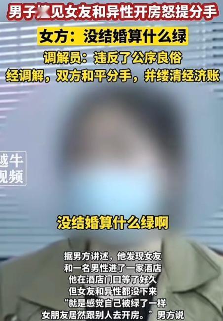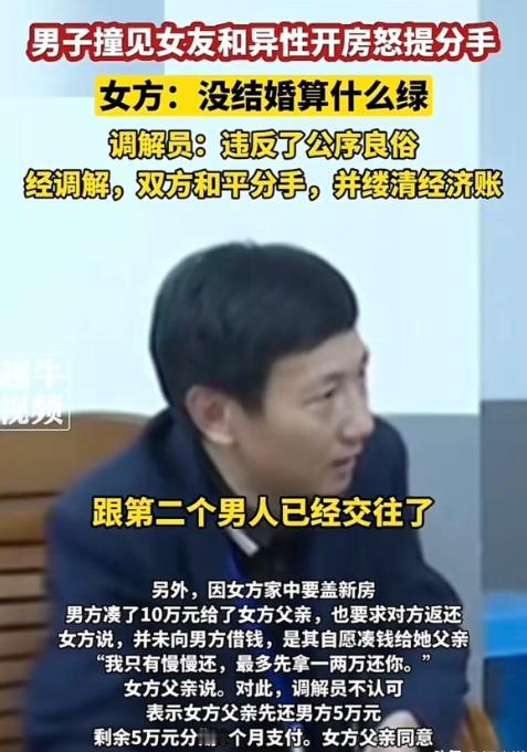 福建一男子,意外撞见女友和一陌生男子进了酒店,男子等了半天都不见女友出来,意识到自己被绿后,男子愤怒质问,女友却说:“没结婚就不算绿”,甚至还提出要分手,之后,男子哭了。   2024年春,福建龙岩,工地旁的小饭馆,下午两点的阳光斜斜地照在桌面,28岁的李涛捏着手机,指尖沾着没擦干净的水泥灰。   朋友把一张女孩的照片推到他面前,说“是我女朋友的闺蜜,叫符茜,和你一样是农村出来的,踏实”。   李涛盯着照片看了半分钟,女孩笑起来的时候,嘴角有个浅浅的梨涡。   那天的风都是暖的,他没想过,这场酒桌上随口提起的相亲,会让他往后大半年的日子,填满欢喜和心碎。   2024年4月12日,相识的第三十天,李涛带符茜去了城里的步行街,他攥着口袋里的工资,咬牙请她吃了一顿人均八十的火锅。   符茜说喜欢橱窗里的那条碎花裙,他趁她去洗手间的功夫,偷偷刷了卡,裙子递到符茜手里的时候,女孩眼睛亮闪闪的。   也是在这天,两人坐在河边的长椅上,符茜点头说“那我们就在一起吧”。   李涛的心跳快得像打桩机,他掏出手机给工友发消息,打字的手都在抖,我谈恋爱了,她很好。   2024年5月,相恋的第二个月,符茜搬进了李涛的出租屋,那间不到二十平米的小房子,第一次有了家的样子。   李涛下班回来,能闻到电饭煲里的米饭香,符茜会把他的脏衣服洗干净叠好,会在他累得不想说话的时候,递上一杯温热水。   每天清晨六点,两人一起挤公交上班,傍晚六点,又一起牵手回家。   李涛开始在枕头底下藏存折,他算了算,再攒两年,就能付个首付,买个小两居,把符茜娶进门。   2024年7月下旬,夏末的一个傍晚,符茜坐在沙发上,低着头抠手指,半天才开口,我哥要结婚,家里想盖新房当婚房,差十万块钱。   李涛没犹豫,他第二天就去银行取了钱,那是他五年的积蓄,是他原本打算买房的首付,钱递出去的时候,符茜抱着他哭了,说李涛,你真好。   那天的夕阳把两人的影子拉得很长,李涛觉得,这十万块花得值,他赌的是一辈子的安稳。   他没发现,符茜转身的时候,眼里的泪光,很快就消失了,2024年9月,入秋后,风开始变凉,出租屋里的温度,也跟着降了。   符茜回家的时间越来越晚,从七点变成九点,再变成十一点,她不再和李涛聊工地上的趣事,不再抢着吃他碗里的肉。   她总是抱着手机躲在阳台,屏幕的光映着她的侧脸,表情是李涛看不懂的柔和,李涛问她怎么了,她只说“工作忙”。   他买了安神的花茶,放在茶几上,半个月过去,茶包没拆封,积了一层灰,李涛心里的不安,像秋草一样,越长越旺。   2024年10月19日,周六,清晨七点,那天李涛醒得很早,他买了符茜爱吃的草莓,洗干净摆在盘子里。   他原本计划带她去城郊的公园,看枫叶,可符茜突然说“老板让我去谈客户,今天没空”。   她拎包出门的时候,脚步很匆忙,连鞋带都系歪了,李涛站在窗边,看着她的背影,鬼使神差地,换了鞋跟了上去。   2024年10月19日,上午八点十分,市中心的阳光宾馆门口,李涛看着符茜走进去,看着一个穿白色运动服的男人迎上来,自然地接过她的包,伸手揽住了她的肩膀。   两人的头靠得很近,说着笑着,走进了宾馆的旋转门,那一刻,李涛的血液像是冻住了,他站在马路对面,浑身发抖,连呼吸都觉得疼。   2024年10月19日,上午八点十五分至八点四十五分,三十分钟,一千八百秒,李涛蹲在宾馆对面的树荫下,秋风卷着落叶,打在他的脸上,像耳光。   他盯着旋转门,心里一遍遍默念:“是谈业务,她很快就会出来”,可门开了一次又一次,走出来的人里,没有符茜。   太阳越升越高,把他的影子缩成一团,像他此刻的心情,憋屈,又绝望,满心怒火的李涛冲进了宾馆。   他想上楼,想推开那扇门,想问问符茜,为什么,前台拦住了他,两人的争执声越来越大,几分钟后,符茜从电梯里走出来。   她看到李涛的瞬间,愣了一下,随即就冷了脸,面对李涛的质问,她先是拿出一份没签字的合同书,硬说自己是来谈业务的。   直到李涛吼出“我看到他揽着你的肩”,符茜才突然笑了,笑得很凉,她说,没结婚,算什么绿?   这句话,像一把锤子,砸碎了李涛大半年的执念,一周后,调解室,符茜坐在对面,理直气壮,那些钱是他自愿给的,我凭什么还?   调解员敲了敲桌子,声音很沉,法律上没有情侣出轨的界定,但你的行为,违反了公序良俗。   最终的调解结果很明确:10万元盖房款,全额返还,那是附条件的赠与,婚恋关系破裂,赠与失效。 爱情的忠诚,从来和结婚证无关,它藏在每一次坦诚的相处里,藏在每一个信守承诺的细节里。