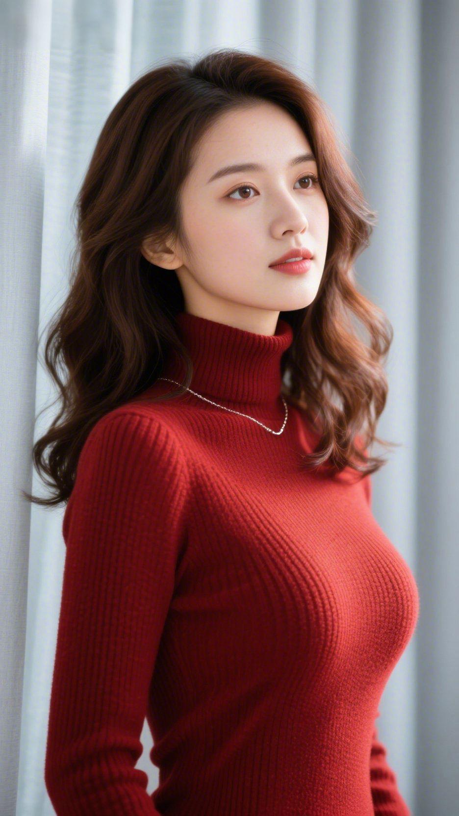 《红衫栖冬光》 薄纱帘拢住几缕冬光,轻落在她身侧的酒红针织衫上,像将浅淡的暖意织进了季节的肌理。 发梢是舒展的卷,随着轻缓的呼吸微漾,颈间细链的碎光,恰好落在衣料的纹路里。她抬眼时,眸光里裹着软绒绒的静,连窗外的风都似放轻了脚步。 不必多言,这一幕已足够温软:针织衫妥帖裹着舒展的松弛,纱帘滤过的光浸着日子的柔,连空气里都漫着“恰好”的安然——是冬月里,不期而遇的一场轻暖。 冬日轻暖 日常氛围感
