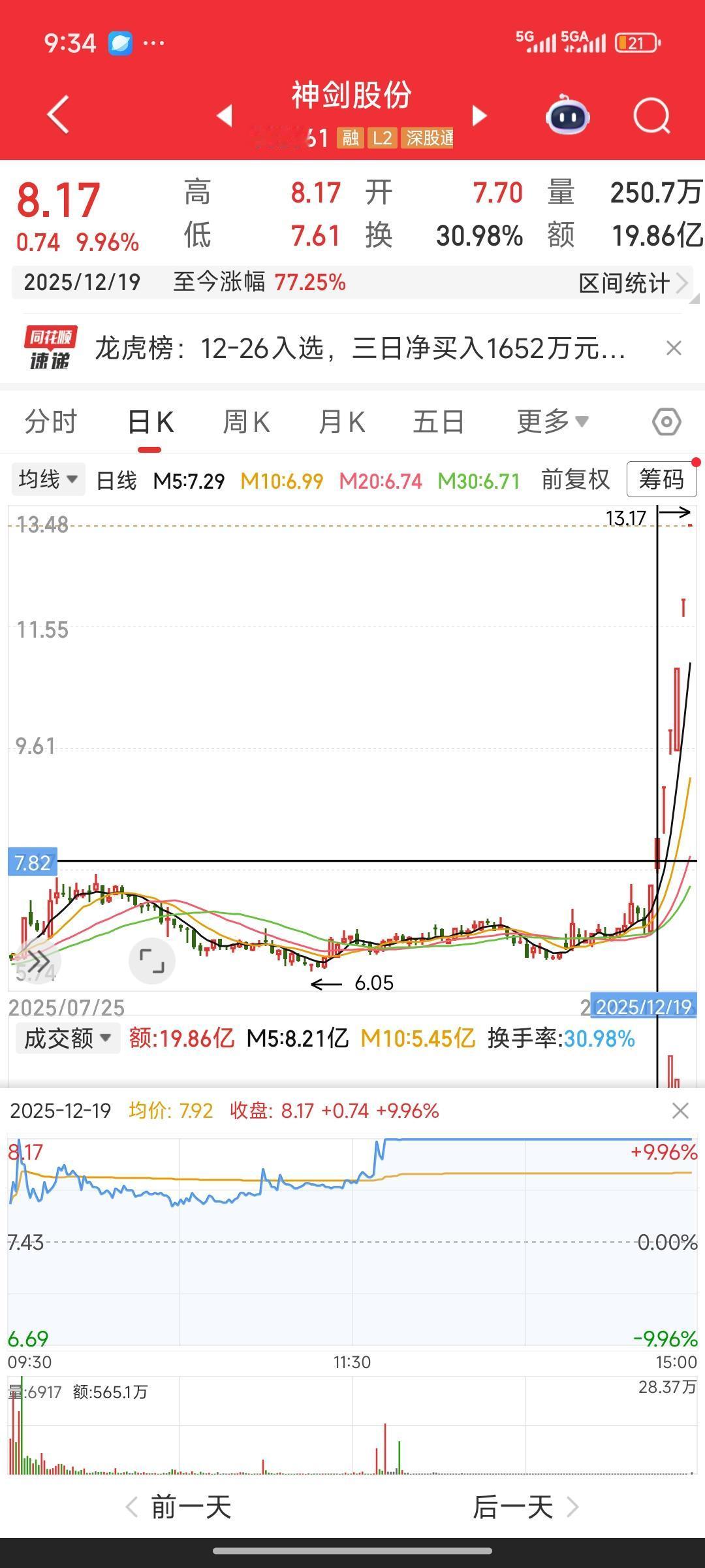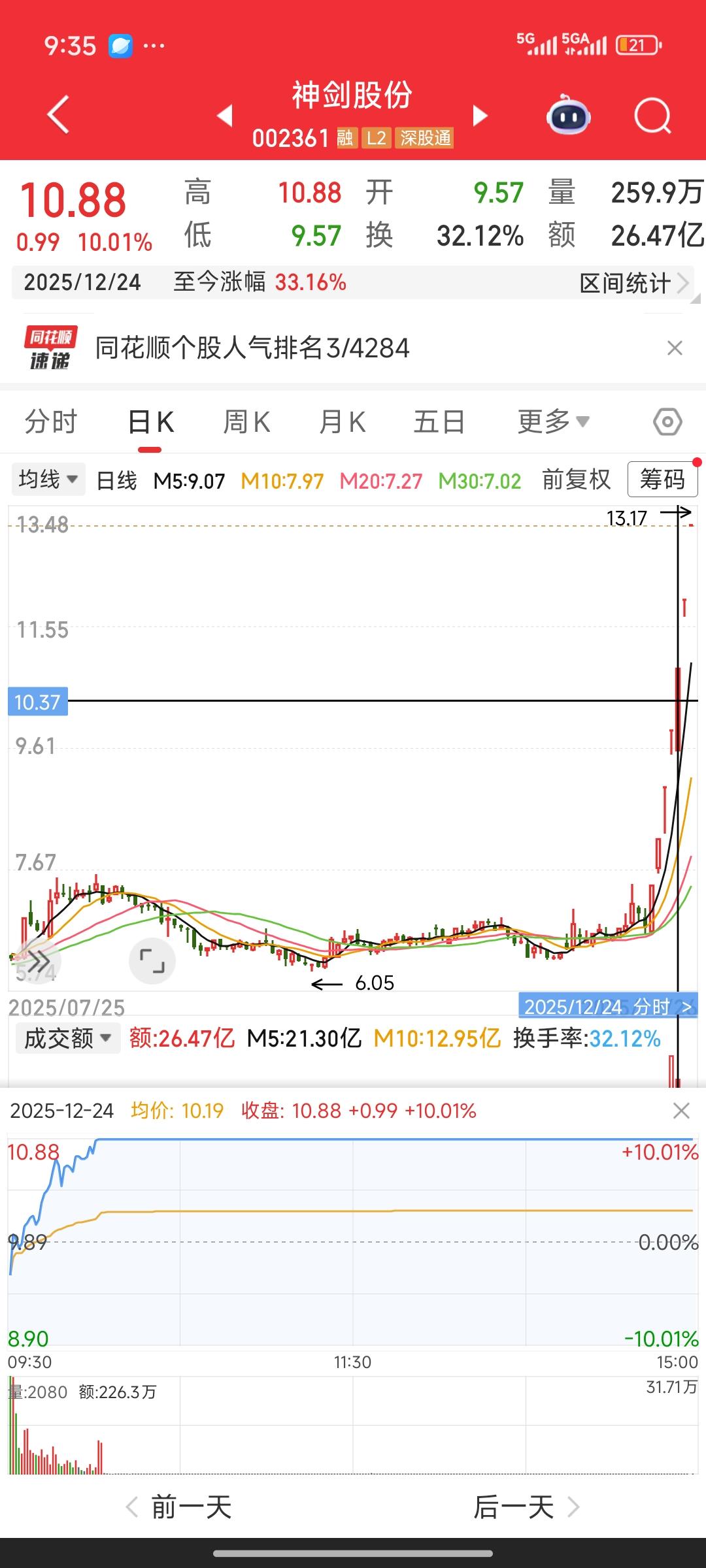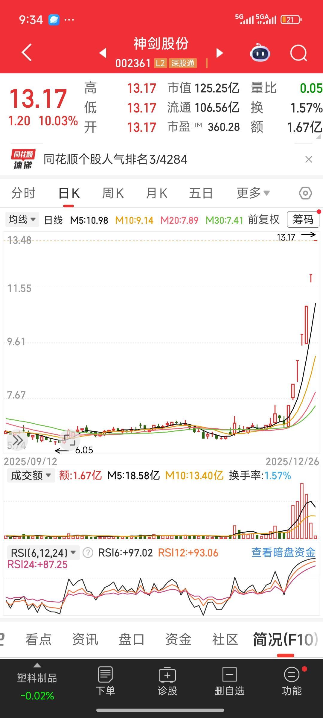 周末复盘一只大牛股——神剑股份。这只股为何能成为大牛股呢?其一,名字取得妙,颇具想象力,“神剑股份”,光是这名字就引人遐想。其二,它有着鲜明的概念,涉及航空航天领域,刚好蹭上了当下的热点。其三,回顾其K线图,能发现主力早已悄然潜入许久。其四,即便在第一个涨停时,我们若仔细观察,虽在上涨初期未能及时跟上,但第二、第三个涨停时,往往还是会给我们机会。通常而言,真正能成为牛股的,有所谓“三板定龙头,三板定妖股”的说法。在第三个板时,成交量一定要大,换手率也要充分,才有可能发展成为牛股。可惜啊,没有提早发现,如今回过头看,又错过了。各位股友,你们是否也有同样的遗憾呢?航天概念股 航空航天概念股 机器人股 机器人个股 深入科技股分析 科技龙头概念股 行业龙股