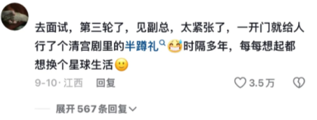 去面试,第三轮了,见副总,太紧张了,一开门就给人行了个清宫剧里的半蹲礼,时隔多年,每每想起都想换个星球生活
