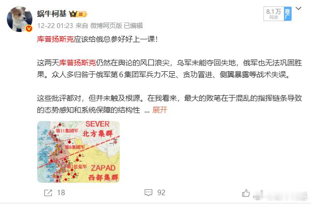 俄罗斯国防部刊登了西部集群各单位指挥官对于库普扬斯克局势的描述。- 第1427摩