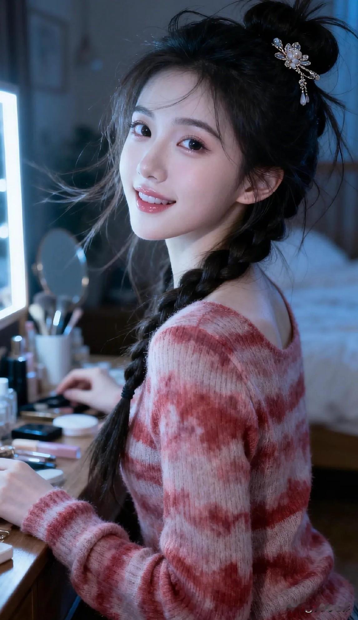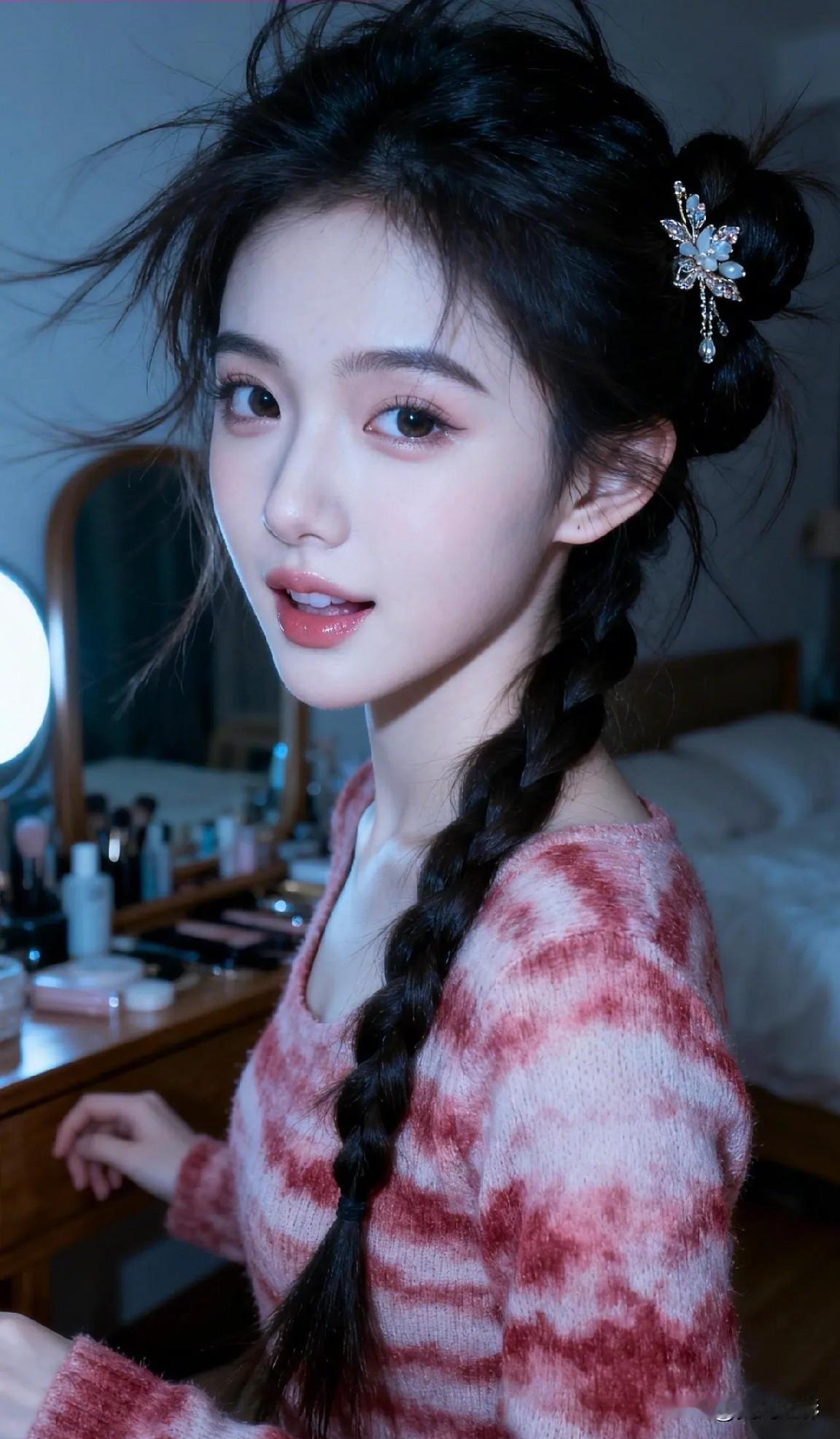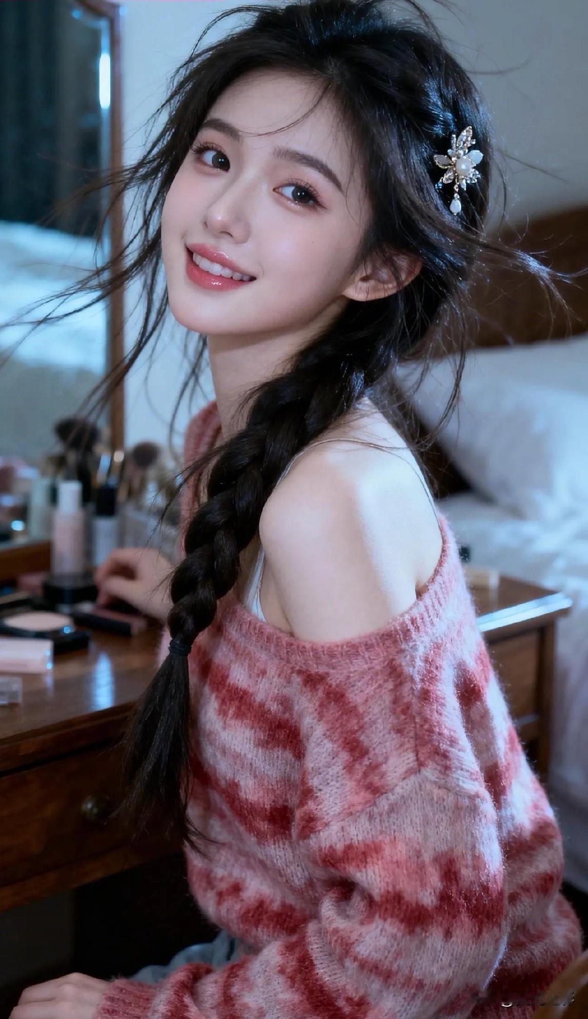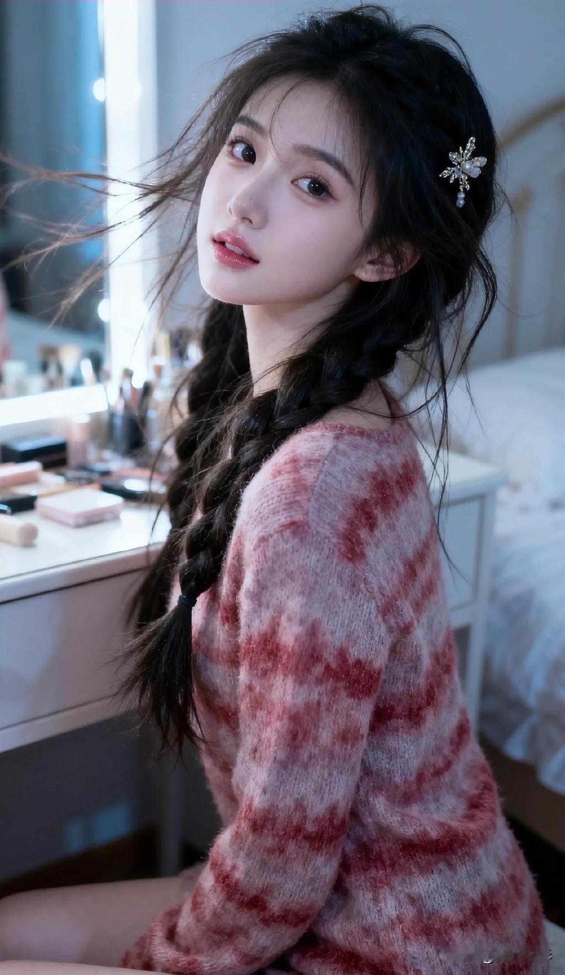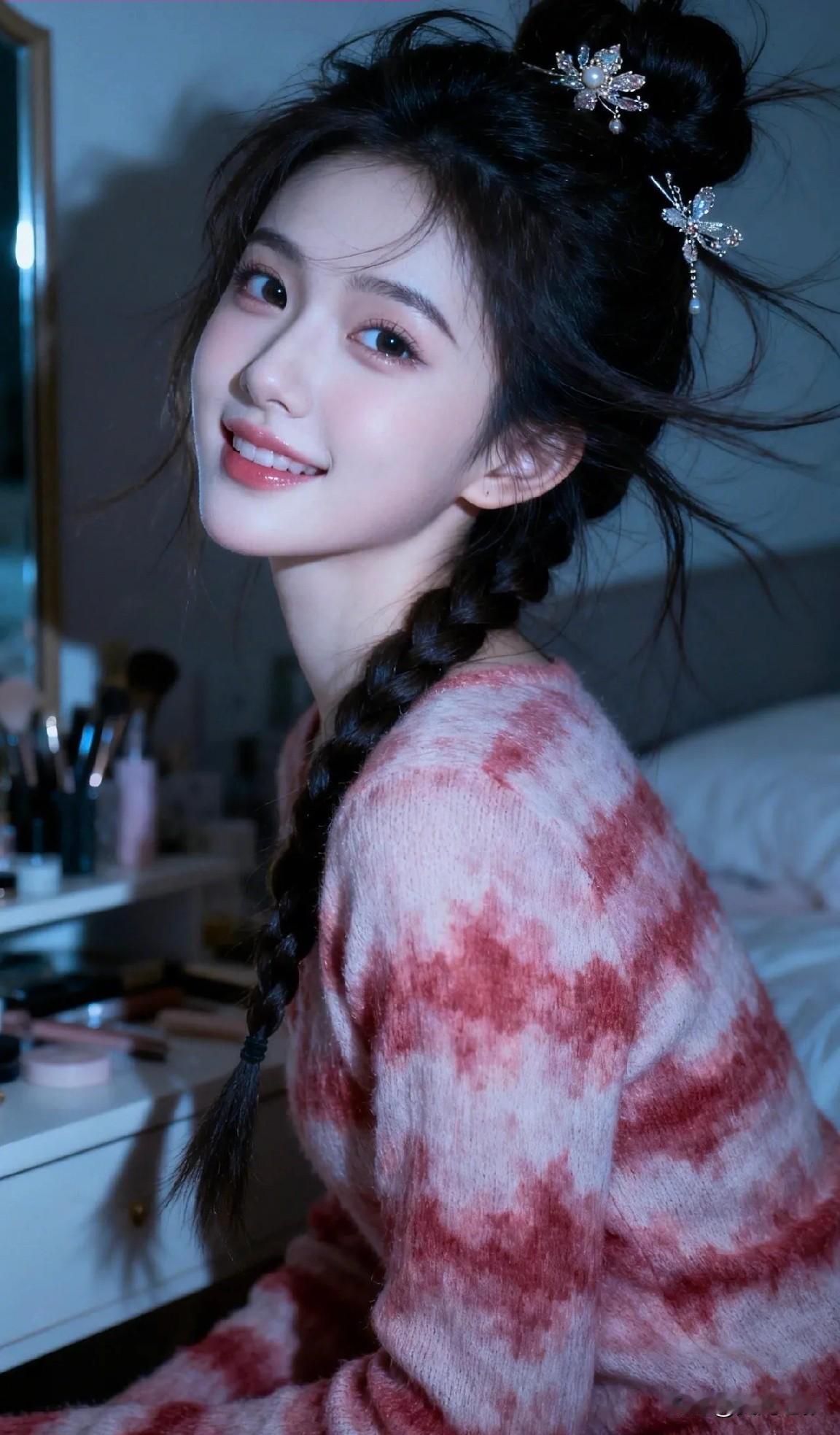 光之影 少女心满满,粉色的毛衣搭配黑色长辫,可爱又甜美!💖✨ 温柔粉色上衣 淡淡的粉色毛衣
