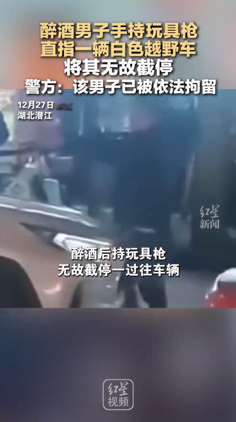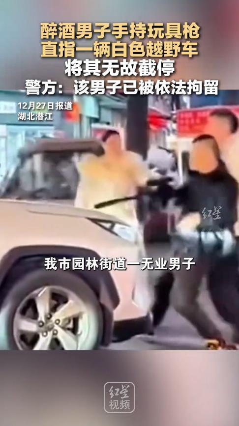 “这下出名了!”12月26日,湖北潜江,一男子喝酒后,手持玩具枪冲到大街上,站在路中间拦截过往的车辆,还打开车门坐进车里打算开走,同行人员虽然一直在阻拦,可是男子丝毫不听。网友:老实交代真枪藏哪了? 生活中,不少人都习惯在休息日的时候,喊上几名好朋友聚餐吃饭,不过喝酒一定要有度,千万别把自己灌得分不清东西南北,惹出来什么祸可就不好了。 当天晚上,男子和几名朋友出来吃饭,期间他喝了不少酒,没一会儿,意识就变得模糊起来,可是令所有人都没想到的是,他竟然拿着一把玩具枪跑到了马路上。 朋友见状立即追了上去,试图把男子拽回来,可是人家的力气很大,根本拽不动,站在路中间就开始拦车! 一辆白车路过时,男子就堵在车正前方,司机担心摊上事,急忙踩了刹车,没想到男子直接拿枪指着对方“威胁”。 这一幕可成功吸引了路人的注意,纷纷驻足观看,见到围观群众越来越多,朋友只能无奈的喊道“丢人呐!” 最终民警赶来处理,将醉酒男子带走醒酒并拘留。 喝酒没有问题,但是喝酒闹事就不行了,不管什么理由,这都不是犯罪的借口! 信息来源:《男子持玩具枪拦越野车,湖北潜江警方通报:一无业男子醉酒后持玩具枪无故截停一过往车辆,该男子已被依法拘留》澎湃新闻
