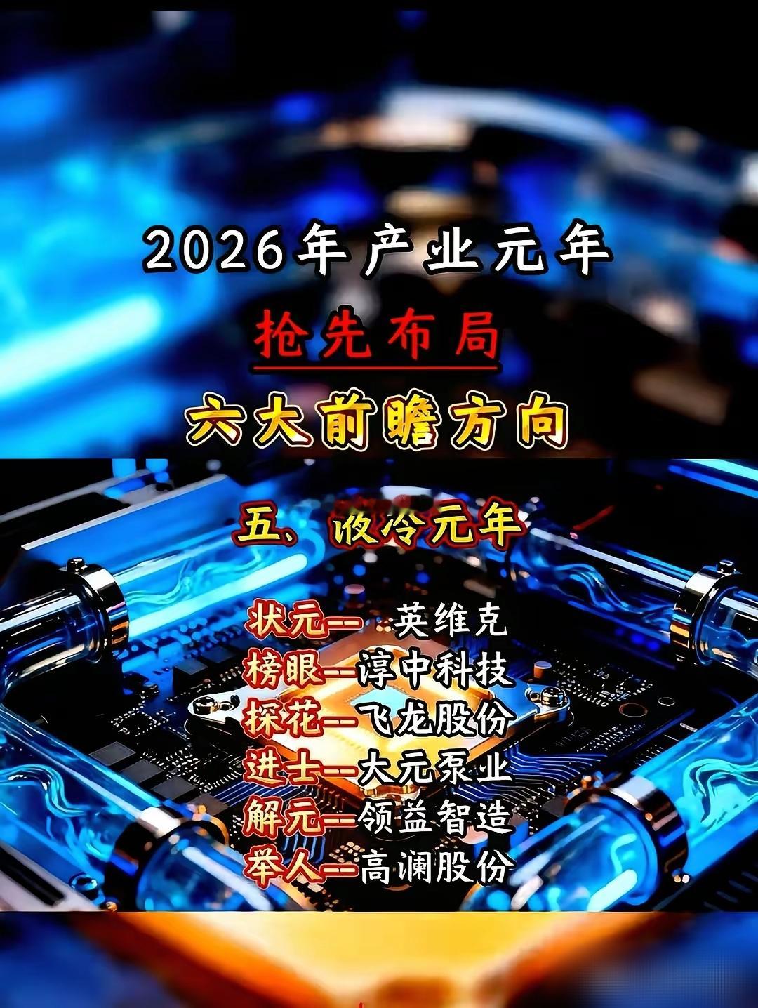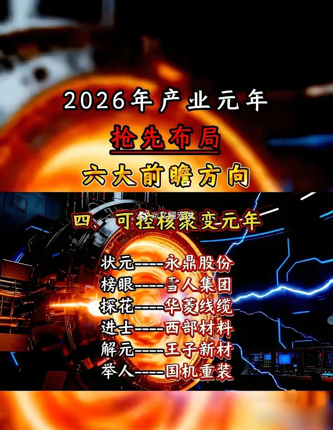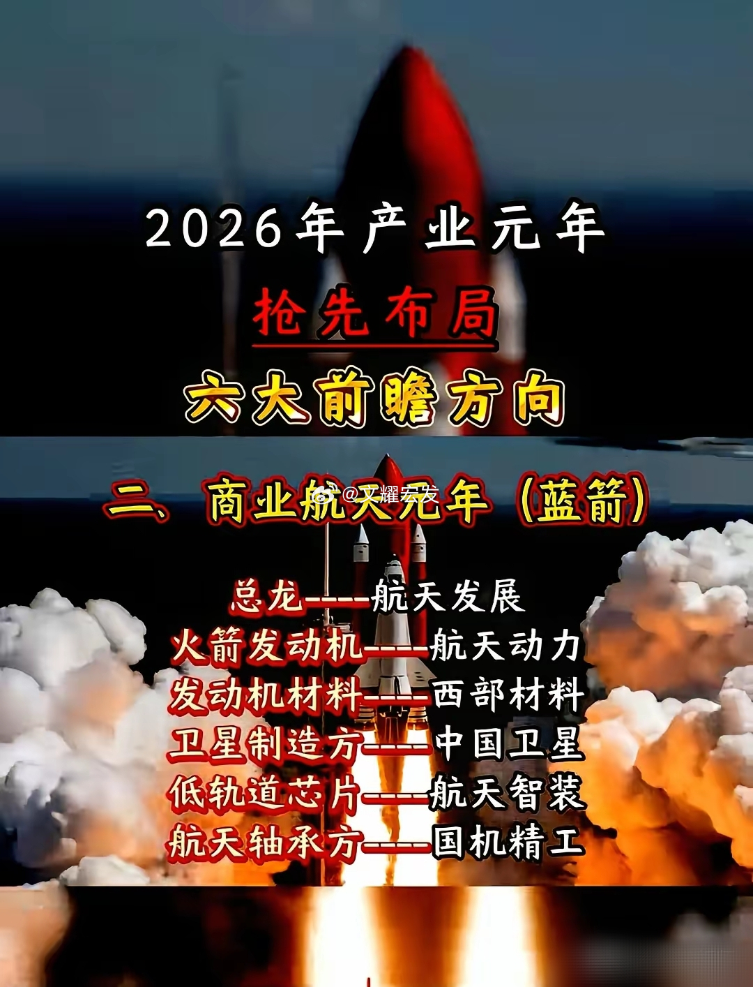 前瞻布局|2026年六大产业核心标的梳理1. 商业航天航天发展、神剑股份、西测测试、西部材料、中国卫星、中国卫通、航天智装、北斗星通、国机精工、航天动力、航天电子、航天工程、航天机电、再升科技、有研粉材、天银机电、中天火箭、派克新材2. 可控核聚变永鼎股份、中国核建、华菱线缆、西部材料、王子新材、理工光科、国际重装、雪人集团3. 自动驾驶浙江世宝、威帝股份、山子高科、比亚迪、索菱股份、北斗星通、德赛西威、通宇通讯、多伦科技、福龙马、首都在线4. 人形机器人中超控股、天通股份、泰尔股份、天奇股份、环宇数控、三花智控、方正电机、浙江荣泰、卧龙电驱、金发科技、万向钱潮、锋龙股份5. 液冷技术永太科技、飞龙股份、淳中科技、英维克、大元泵业、领益智造、高澜股份6. 数字经济佳缘科技、电科网安、东信和平、京北方、四方精创、恒宝股份、安妮股份、达华智能、翠微股份、力合科创以上内容为公开信息整理,仅供参考不构成投资建议。