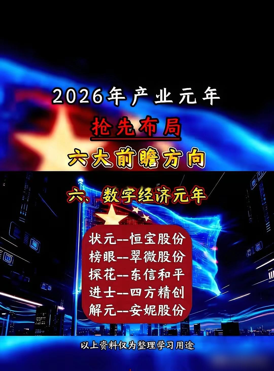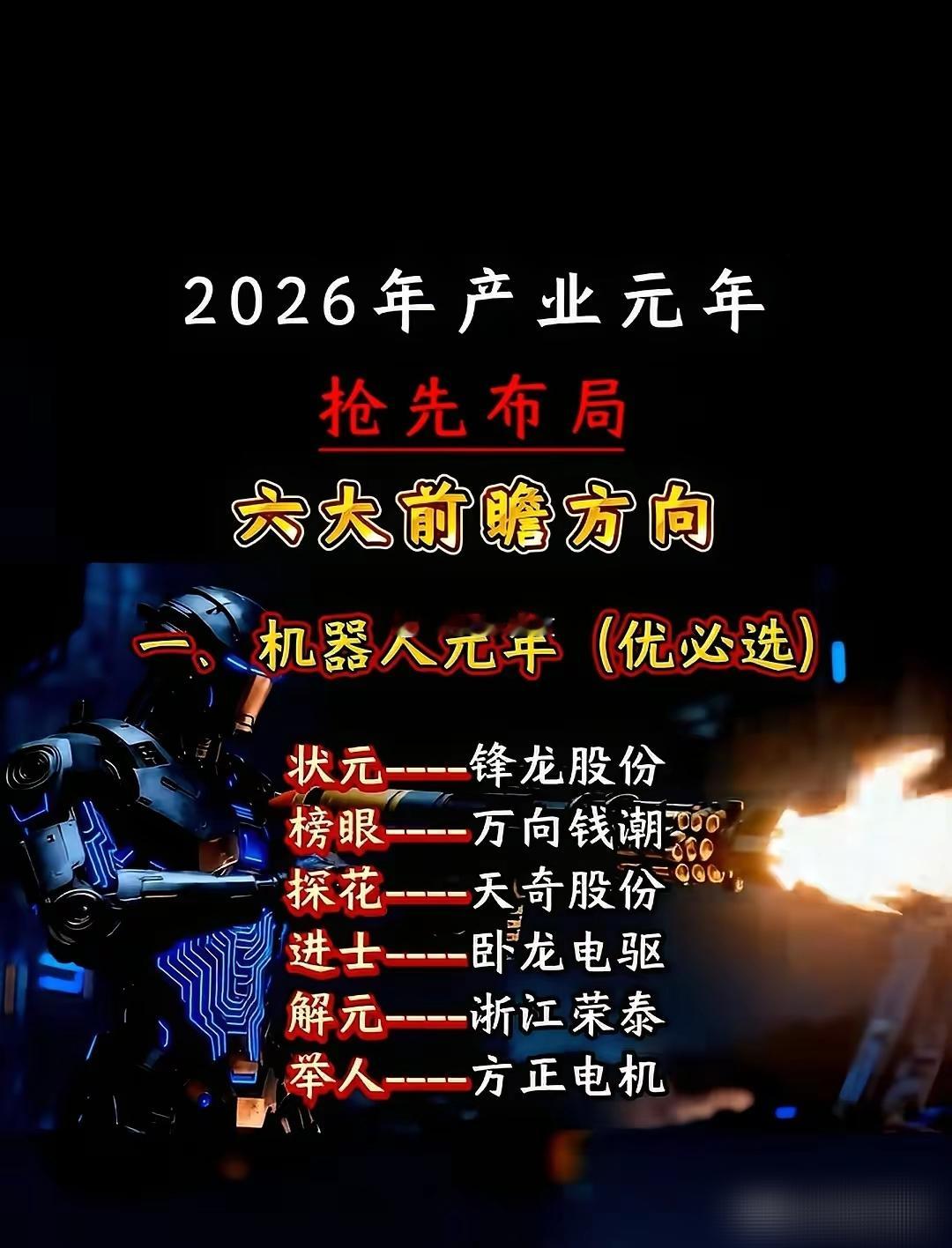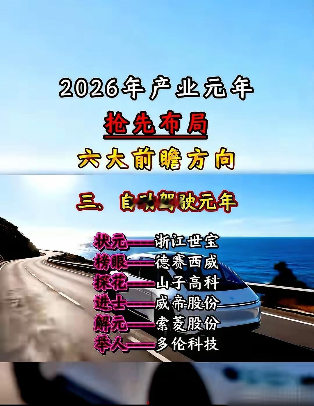 前瞻布局|2026年六大产业核心标的梳理1. 商业航天航天发展、神剑股份、西测测试、西部材料、中国卫星、中国卫通、航天智装、北斗星通、国机精工、航天动力、航天电子、航天工程、航天机电、再升科技、有研粉材、天银机电、中天火箭、派克新材2. 可控核聚变永鼎股份、中国核建、华菱线缆、西部材料、王子新材、理工光科、国际重装、雪人集团3. 自动驾驶浙江世宝、威帝股份、山子高科、比亚迪、索菱股份、北斗星通、德赛西威、通宇通讯、多伦科技、福龙马、首都在线4. 人形机器人中超控股、天通股份、泰尔股份、天奇股份、环宇数控、三花智控、方正电机、浙江荣泰、卧龙电驱、金发科技、万向钱潮、锋龙股份5. 液冷技术永太科技、飞龙股份、淳中科技、英维克、大元泵业、领益智造、高澜股份6. 数字经济佳缘科技、电科网安、东信和平、京北方、四方精创、恒宝股份、安妮股份、达华智能、翠微股份、力合科创以上内容为公开信息整理,仅供参考不构成投资建议。