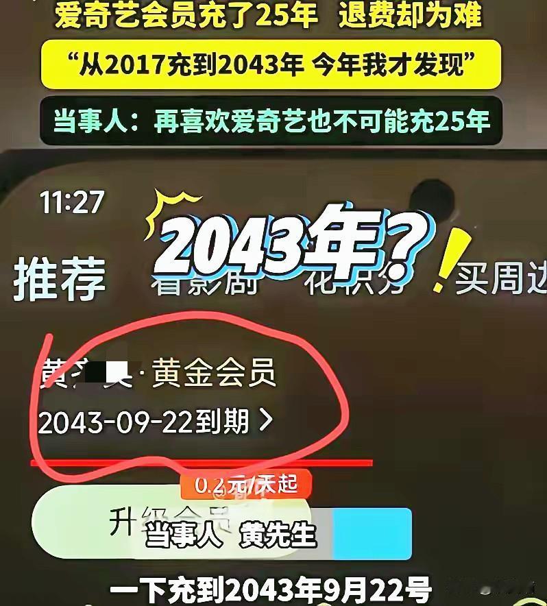 会员一口气充到了2043年! 河南这位老哥追剧时吓一跳, 一查才发现家人几年前被促销冲昏头,砸钱买了25年会员,比房贷只短5年。如今想退款,平台嘴上说能退,却坚持原路返回早已注销的支付宝——这钱摆明要打水漂。 平台只管收钱时痛快,退费时却对账号变更、生活变数视而不见,一句“按规定办”就把责任推得干干净净。消费者难道活该为这几年的变化买单?