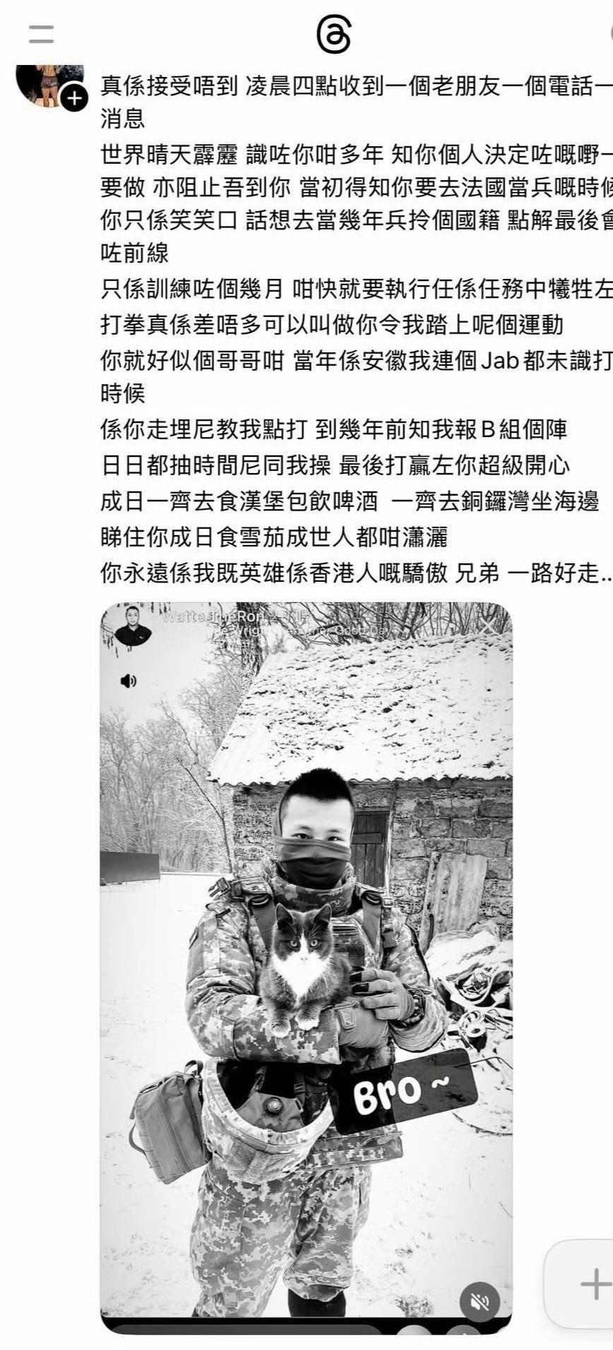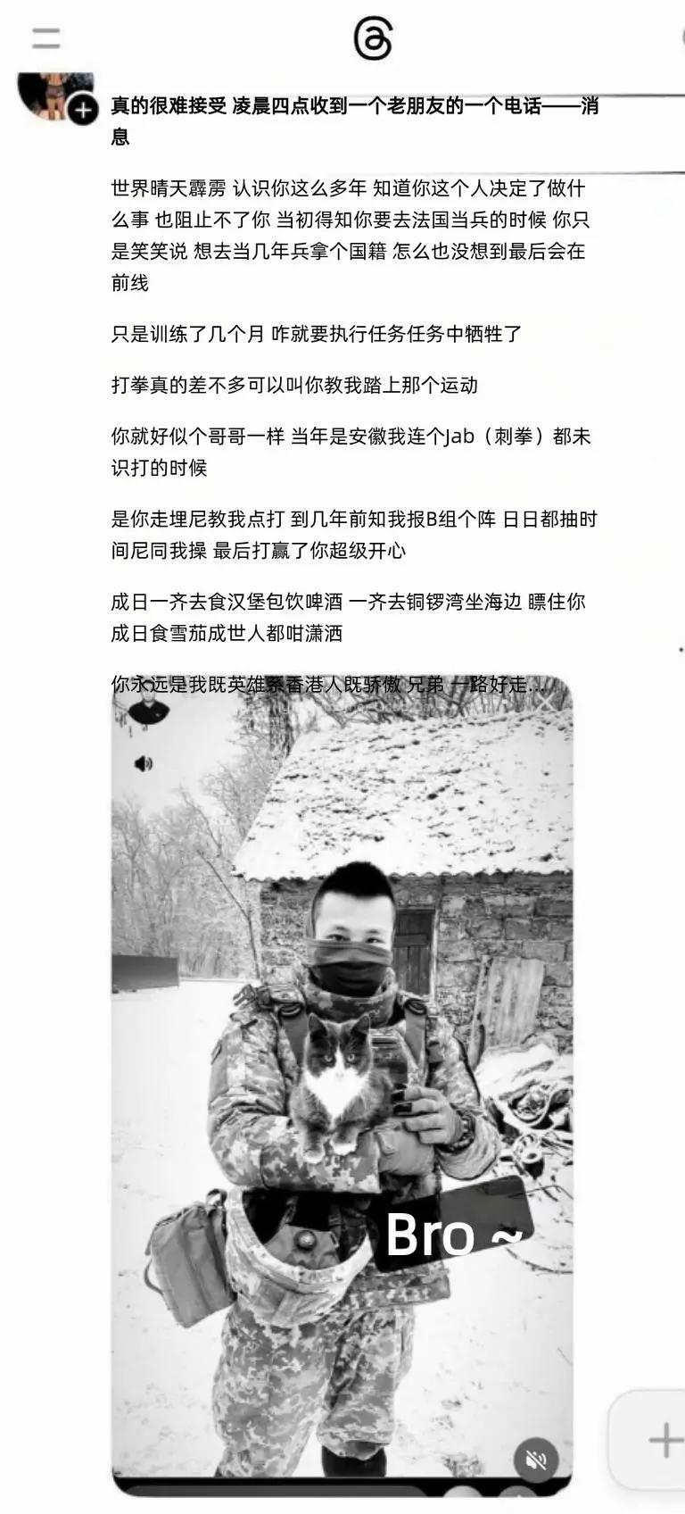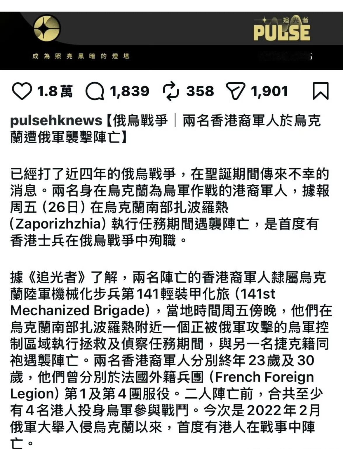 俩黄尸,羡慕乌克兰,向往乌克兰,前往乌克兰,魂归乌克兰。 26日,周五,两名黄尸裔在乌克兰当雇佣军阵亡。 这两个勇武黄尸裔以前当过法国外籍雇佣兵。一个23岁,一个30岁,原职业一个是攀岩教练,一个是保镖。两人隶属乌克兰陆军机械化步兵第141轻装甲化旅。当地时间周五傍晚,他们在乌克兰南部扎波罗热附近的一个正被俄军攻击的乌军控制区域执行拯救及侦察任务期间,与另一名捿克籍士兵遇袭阵亡。他们训练了几个月,才加入一个月就死了。 据称,共有4名港人加入乌克兰雇佣兵团。 这俩黑武,好歹比那些口头支持乌克兰的强,没停留在口头上,以身赴道。