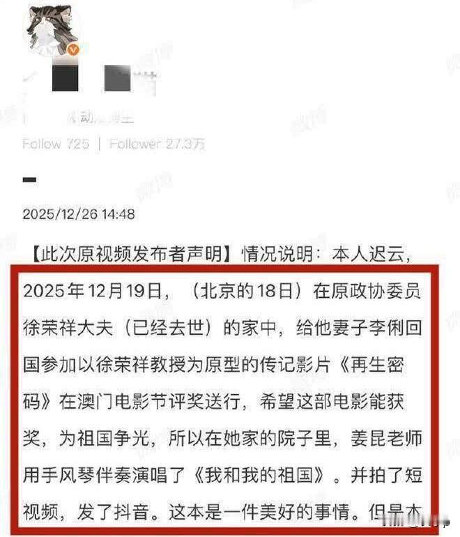 昨天姜昆视频拍摄者回应 前几天老艺术家们在美国过圣诞节的事 她叫迟云,她拍视频的时间是19号 是在洛杉矶的朋友家中拍的,唱歌是为了给老朋友送行,因为这个朋友要去澳门参加电影节评奖 ,跟加利福尼亚没有关系,圣诞节的时候姜昆根本没在美国,她说视频被极少别有用心的人,恶意剪辑借题炒作,挑动网友情绪 至此真相大白了,拍摄者做出了澄清,还了姜昆清白 此外姜昆的助理发文称要起诉那些造谣生事者 看来有些人真是误会他了,大部分的人看到类似的这种事,都非常的感兴趣,有些人就专门利用了这一点