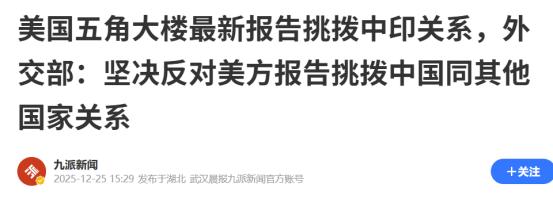 和中方一言不合就掀桌?2025年12月25日,印度在试图“掀桌子”,美国介入挑拨中印关系,中方强势回应! 我国同印度的关系非常复杂,在往来的多年时间里,中印边境问题始终是一个难以解决的历史遗留问题。两国更是因此产生过激烈的冲突,但就在今年,印度方面主动释放了友好信号,想要同我国缓和关系。 在两国高层官员的互动下,中印关系终于有了缓和的迹象。可就在这个关键时刻,印度却疑似想要“掀桌子”。 根据外媒流传消息,印度试图在中印边界线印度那一侧去部署军事装备。这一点还未得到印度等官方的证实,但就在这个背景下,美国却试图挑拨中印关系。 针对美国的种种行为,2025年12月25日的时候,外交部就明确做出了回应。发言人就指出中印边界局势总体稳定,双方的沟通渠道畅通,反对有关国家对此评头论足。 并且在回应相关问题的时候,明确强调中印边界问题是中印两国之间的事情。针对同印度缓和关系这一点,我国已经释放了满满的诚意。 两国关系是进一步缓和,还是再次恶化下去,更多的选择权在于印度。中国掌握着主导权,而印度只需要去配合的做出选择。 如果印度选择同中国缓和关系,那么中印两国能够强强联手,共创辉煌。可如果印度选择掀桌子,同我国再次走到对立面,那么相信我国也不会惯着。 在外交方面,中国从不寻求主动与其他国家开火,但这并不意味着中国没有开火的能力。对此,您怎么看?欢迎评论区留言您的看法,我们一起讨论一下。 (信息来源:中印关系“回暖”来之不易,两国未来合作该向何处破局?-聚焦中国) (信息来源:美国五角大楼最新报告挑拨中印关系,外交部:坚决反对美方报告挑拨中国同其他国家关系-九派新闻)