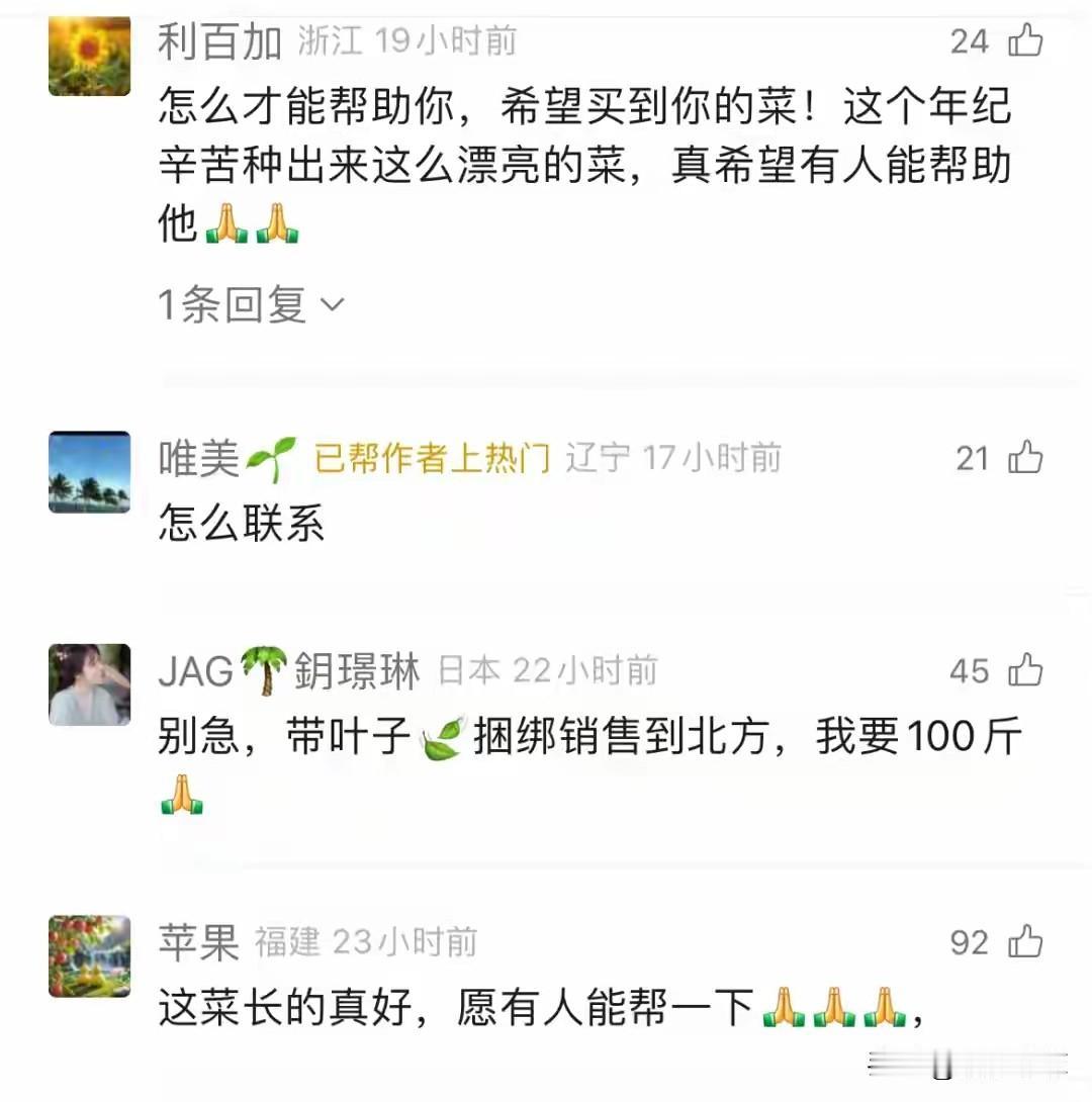 浙江湖州德清的菜农王为杰,最近看着地里上万斤长势喜人的蔬菜,却急得直掉眼泪——29岁的儿子突发心梗离世,家里的顶梁柱塌了,老伴去年刚做完心脏手术干不了重活,两个小孙子还等着吃饭,这满地的菜要是烂在地里,一家人的生计都成了问题。 一开始看到这成片的蔬菜,王为杰脑子里只有一个念头:“这都是我和儿子一锹一锹种出来的,说啥也不能让它烂掉。” 他试着自己拉去市场卖,以前父子俩搭档,一天能卖近400公斤,现在他一个人忙活,从采摘到运输全靠自己,一天顶多卖150公斤,看着剩下的菜一天天变老,他急得直抹眼泪。 他本以为这上万斤蔬菜只能眼睁睁看着烂在地里,自己这辈子都没这么无助过,连找人帮忙的念头都不敢有——怕麻烦别人,也怕没人愿意管这档子事。 结果转机来得猝不及防。12月25日,当地媒体知道了他的遭遇,把这事报道了出去。 没想到,消息刚发出去没多久,公益组织和街道就主动找上门,帮他开通了线上爱心销售通道;村干部也带着志愿者赶来,一群人在菜地里忙活,采摘、分拣、打包,分工明确,原本冷清的菜地一下子变得热热闹闹。 更暖心的是,不少企业也伸来了援手。德清县新世纪大酒店的总经理直接跑到菜地,说食堂每天先采购50多公斤,不够再加;德清县供销集团更实在,直接承诺兜底,只要还有没卖掉的菜,就帮他对接销路。线上的订单也一个接一个,大家不光买菜,还有人特意送来米、油和新棉被,连孩子的零食玩具都带了过来。 短短一天时间,基地销售和预售的蔬菜就超过了6万斤。 王为杰看着眼前的景象,红着眼眶说:“大家这么帮我,我只能把最好的菜挑出来,不能辜负这份心意。” 这事说到底,一半是人间疾苦,一半是人间温暖。王为杰守着本分,再难也没想着靠别人;而那些伸出援手的人,没喊什么口号,只做了最实在的事。 其实生活就是这样,你永远不知道意外和善意哪个先来,但只要有人愿意搭把手,再难的坎也能迈过去。 这世上最珍贵的,从来都是这份不期而遇的温暖。 你们对此事怎么看?