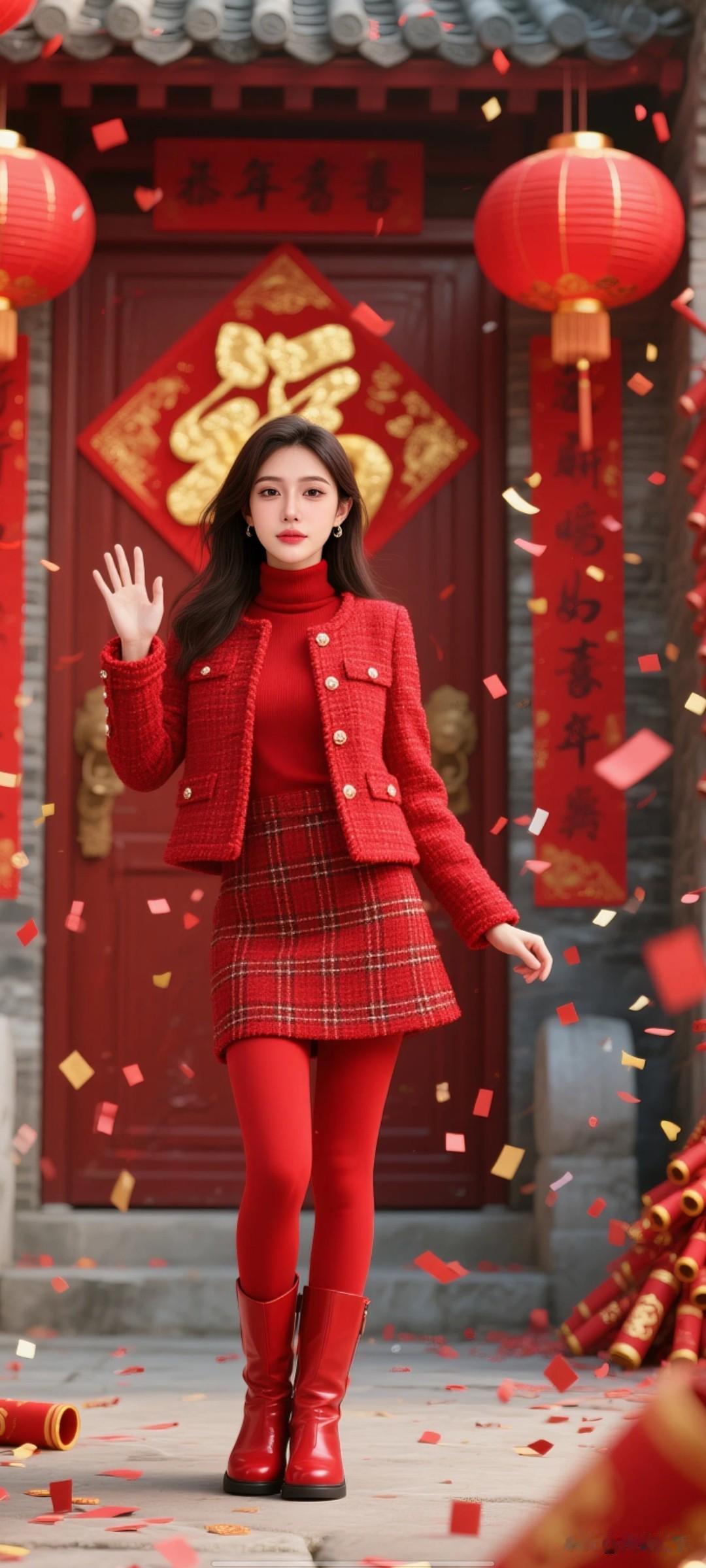 每天美丽照片分享美女,肤白貌美,皮肤白嫩有光泽,温柔有气质,妆容精致,肌肤白皙,嘴唇饱满,全身正面照,中长发,穿着红色小香风外套,红色高领内搭,红色格子短裙,跟衣服一模一样,红色打底裤。红色马丁长靴,手做一个恭喜!高清,越清晰越好。背景站在春节氛围门口浓郁的场景中,呈现出极具立体感的红色调画面,有新的3D立体效果,比如红色的灯笼以独特的3D立体形态悬挂在街道两旁,红色的春联张贴在崭新的大门上,3D立体效果凸显出春联上的金色福字熠熠生辉,周围环绕着红色的鞭炮纸屑形成3D立体的散落形态,整个场景充满春节的喜庆氛围。