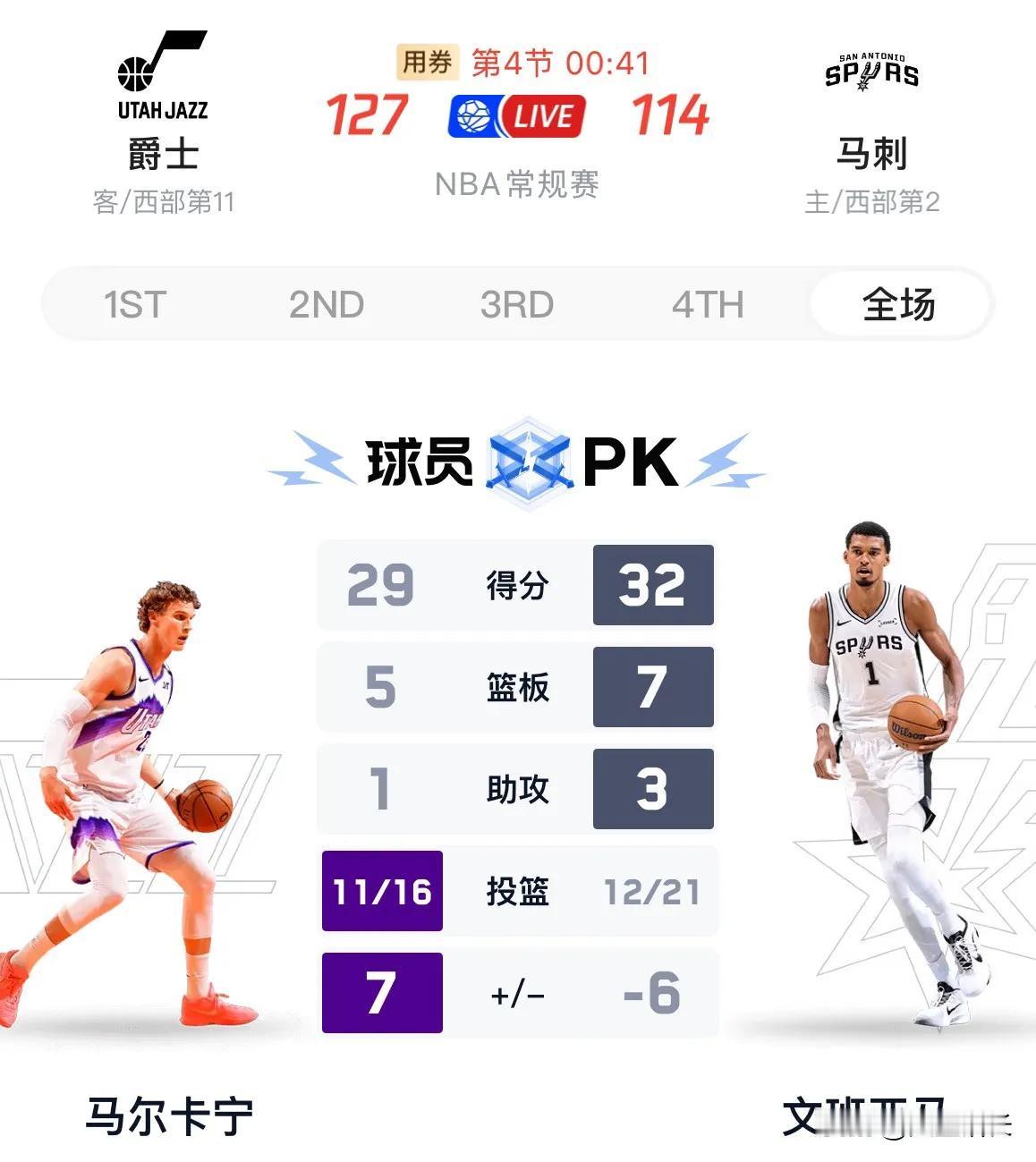 文班亚马icon真是不适合首发,今天久违的第一次首发,砍下32分7板3助,仍然无法阻挡弱旅爵士,能三杀西部第一的雷霆,却无法战胜第十一的爵士,马刺icon变阵让文班亚马首发。 显然破坏了马刺的化学反应,当然今天马刺福克斯休战也是一大原因,目前的马刺经验丰富且有攻坚能力的,福克斯当仁不让。今天马刺被爵士终结8连胜,也可谓是大爆冷了! 文班应该打替补。🤦 网友表示:我是怀疑打假球,很明显两个地!第二节,领先好好的,直接上第三阵容,防防不住,投投不进,活生生给爵士反超了!第四节,文班追上十分分差,打平了,起势了!然后被换下,又拉开了分差!这不是在控分?是在干啥??😊 感觉雷霆每一个人出手,不管文班亚马在不在身边。都会不自然的调高弧度。 文班有天赋,有想法,有追求,现在还远未到他的上限。马刺真的是有大运气的球队。一个石佛震慑联盟十多年,现在又来了一个高僧。 文班:怎么了,我模仿MVP不像嘛。😄 文班亚马特别喜欢中国,所以他是我们的好朋友,老朋友。👍👍👍 广东朋友表示:文班太强了,不愧是少林第一高僧,夏天去了一趟少林寺整个人完全蜕变,少林寺真的是神奇的地方。 文班是要把少林真功夫带到NBA赛场,说不定还真能镇追梦。锁喉,踢裆,垫脚这些非蓝球动作在大文班面前要慎用哟。 文班看起来比切特强很多,但是切特有冠军了,这就是篮球,是否能夺冠个人能力很关键但是好的一个团队才是最重要的。 就这么说吧,凯尔登是除了文班,第二个不会交易的,哪怕会动卡斯尔或者哈珀!马刺打到现在的位置,凯尔登是精神层面的领袖,球队现在能拧成一股绳的关键! 文班非人类,卡斯尔巨星气质,小狐狸邮差带信,哈珀冠军属性,科内特油漆区保护神,哇塞一剑封喉,尚伯尼百步穿杨,烧鸡手抱炸药包,奥利传统学术,琼斯得分探囊取物,卡布飞天遁地,奥斯特定点清除,英格拉姆有待进步。