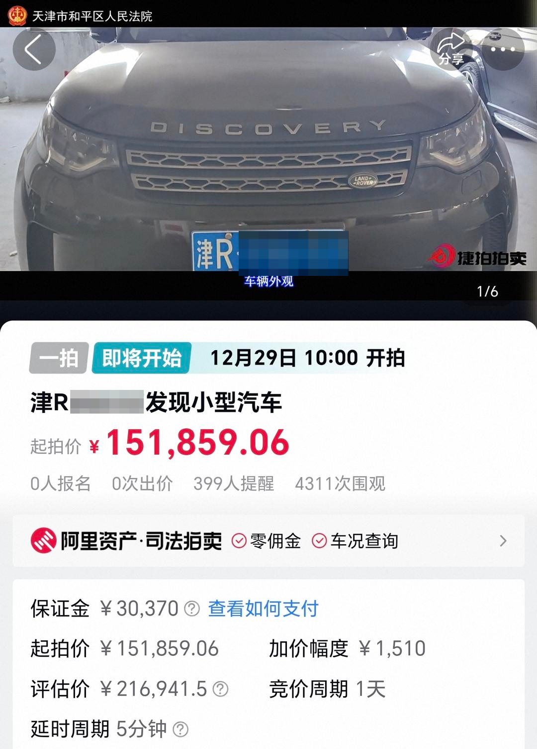 【#一辆首发限量版路虎15.1万起拍# 】#一路虎发现首发限量版将被司法拍卖# 12月28日,红星新闻记者从阿里司法拍卖平台获悉,天津市和平区人民法院将于12月29日对一辆2017年出厂的首发限量版路虎车进行司法拍卖,起拍价151859.06元。拍卖平台信息显示,这是一辆黑色路虎车,出厂日期为2017年7月1日,2018年注册,系路虎“发现”首发限量版,评估价216941.5元。车况一栏显示,车辆能正常启动,左前门、后备箱、后杠、右后门有碰撞痕迹。车辆检验有效期至2026年3月31日,截至2025年11月3日,查勘车辆时行驶里程为78973km,有违法未处理。竞买公告中提醒,该车辆的违章和罚款缴纳需由买受人自行负责处理,参与竞拍即视为接受该条款。据悉,本次起拍价为151859.06元,保证金30370元,增价幅度为1510元。法院在公告中还特别说明,2025年11月3日查勘车辆时,车辆发动机号所处位置不便于查勘,无法确认与机动车登记证记载的信息是否一致,可能有无法过户的风险。截至记者发稿时,该车辆拍卖尚无人报名,有399人设置提醒。网页链接