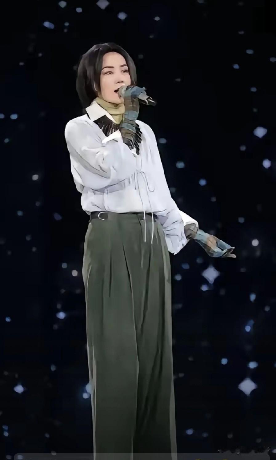 阔腿裤登上了大雅之堂! 曾被网友吐槽,谁儿穿谁儿难看的阔腿裤,被王菲穿上了,并且,穿着它参加了2026年春节联欢晚会的彩排。 一件白色衬衫,配一条军绿阔腿裤的王菲,干净清爽,一头直发显得又年轻又漂亮。 穿阔腿裤还得大长腿,腿长且直穿着不光显身材,还能弥补年龄大腿细的缺陷,真是啥时兴,啥好看。