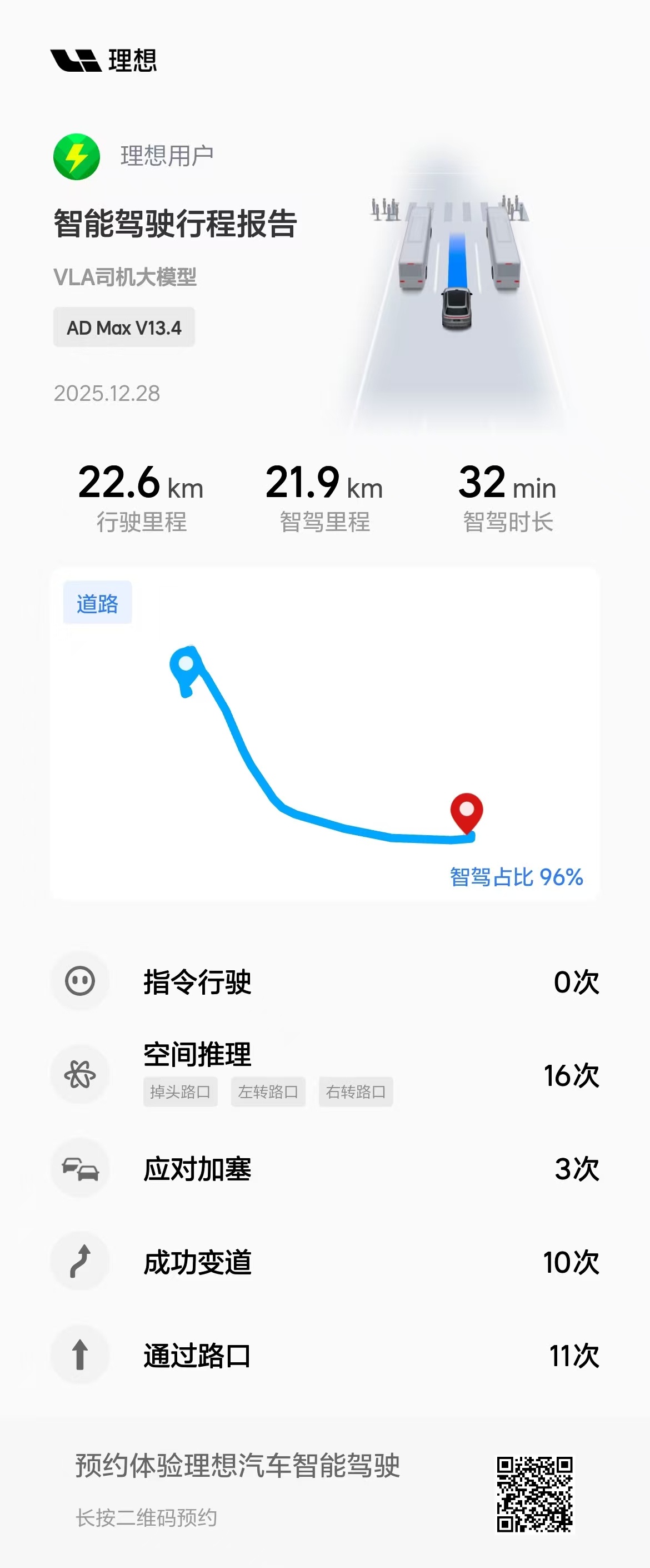 理想VLA 8.1版本初体验22.6公里,智驾里程21.9公里,占比96%,整体能力还是很强的。一次是走错了路,我接管了,期待VLA能读懂导航的那一天一次是需要变到右转车道,变道时机太晚,为了防止跨实线,只能手动接管。全程只有上述两次接管。另外,还有两个细节的处理不是很好:一是NOA状态下车道保持时不时会偏左;二是在绕行回到车道时,动作幅度过大,为了调节车身,有时会「左拐右拐」,像很别扭的新手司机理想汽车理想i6