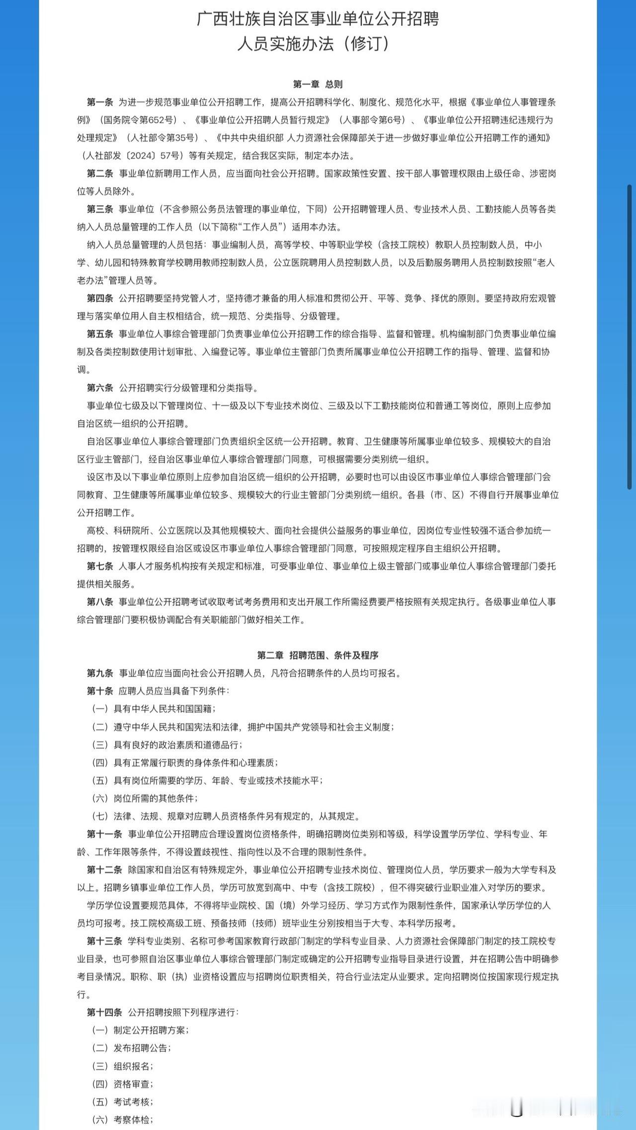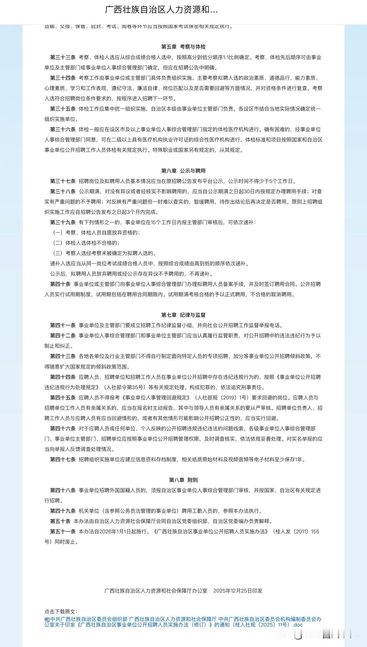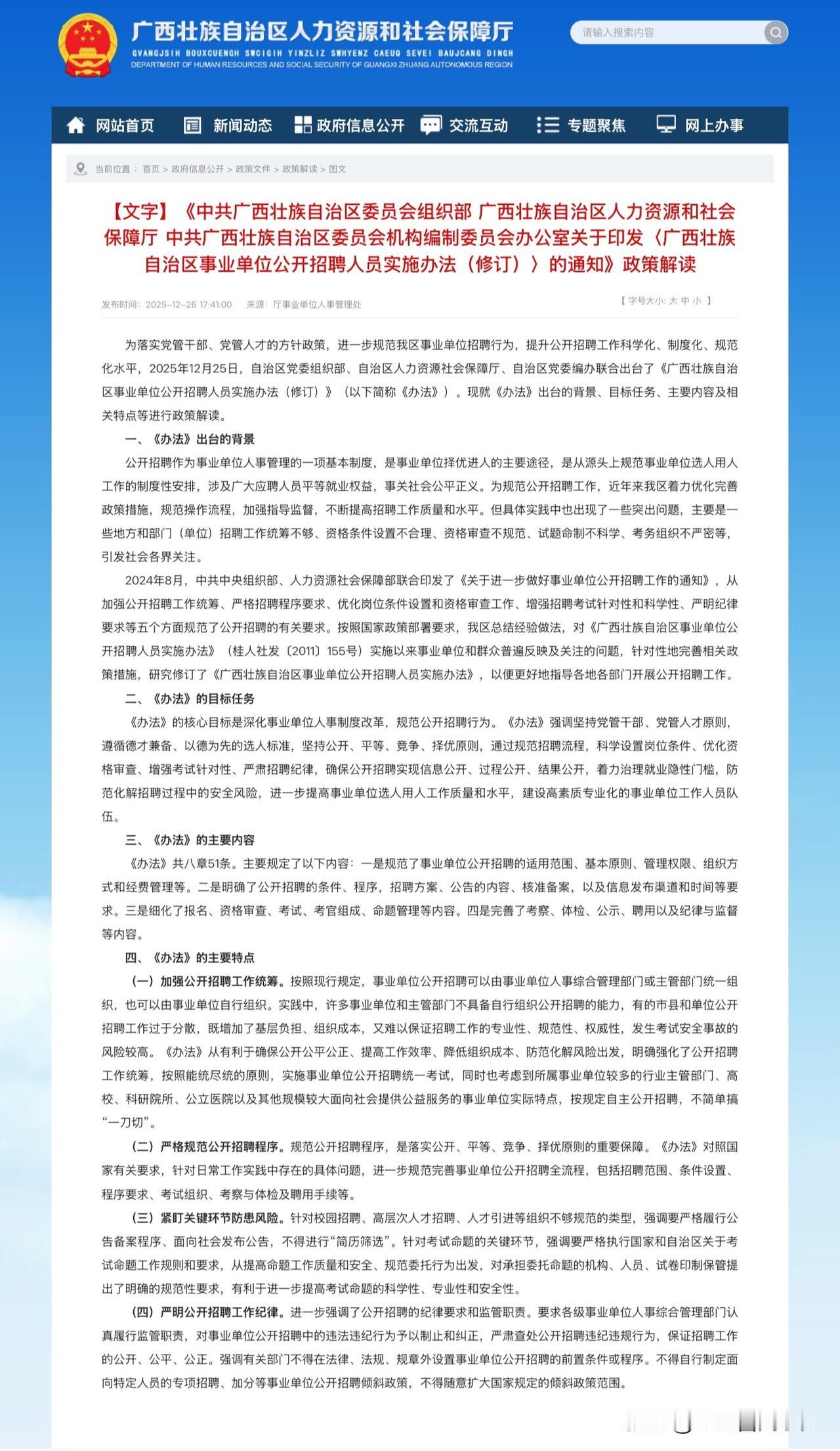 新版《广西事业单位公开招聘人员实施办法》发布,于2026年1月1日起实施,全文可以说是“动真格了”,瞄准了群众最反感的那些招聘乱象,这个新办法对想考事业单位的普通人来说是大利好! 但关键还得看 “疗效” —— 规定写得再好,如果下面执行时“打折扣”、搞“灵活变通”,那还是白搭。所以,好政策出台了,下一步更得看监管部门是不是真查、真罚,让这些“红线”真正通上电[赞][赞] 冬日生活打卡季