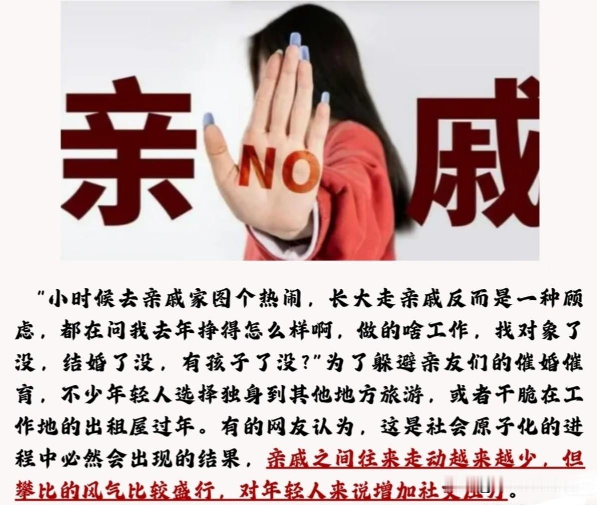 断亲在零零后等年轻一代中确实是一个普遍现象,但这更多指的是一种社会交往模式的理性化选择,而不是完全断绝血缘关系。这并非简单的年轻人冷漠,而是多种社会结构性力量共同作用的结果。你可以通过下面的要点快速了解 城市化与人口流动,人们从熟人社会(乡村)进入陌生人社会(城市),亲缘关系的地理基础被瓦解。很多年轻人从小就和亲戚分开居住、少有见面,缺乏共同生活经历和情感基础。年轻人注重个人边界感,而部分亲戚的催婚、催生、攀比学业工作等行为,常被年轻人视为过度关心或伪善意的指点。 年轻人自身面临巨大的学业和职场压力,没有多余精力去经营和维护复杂的亲戚关系。一项针对1082名青年的调查显示,超过七成的人认为亲戚难以满足他们的情感支持和社会互助需求,这是导致断亲的关键原因。 是年轻人基于情感满足、相处舒适度、价值观契合度等标准,对社交圈进行的一次主动筛选和重构,其核心逻辑从血缘为先转向相处舒适。断亲呈现形式疏离而情感存续的双重特征。年轻人并非完全割裂亲情,而是在减少无效社交的同时,可能依然保持着对核心亲人的情感。 这是全球现代化、个体化进程中普遍出现的现象,是传统亲缘关系在现代社会的一种适应性变化,零零后的断亲潮,可以看作是社会转型下,新一代对传统亲缘关系模式的一种温和的现代化改造,其目的是在快速变化的时代里,构建更符合自身需求的社会支持系统。