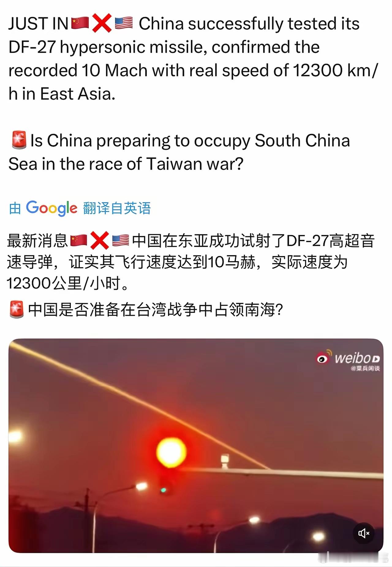 外媒出口转内销的消息:中国在成功试射DF-27高超音速导弹,飞行速度实测12300公里/小时,合10马赫!10倍音速,也就是说,2千公里,10分钟不到就打到了。而外媒说东风27不仅仅射程高达5千公里以上,而且还是反舰弹道导弹。也就是说,美国人要介入台海,离台海还在2千公里、航母作战距离之外的地方,就可能被在中国内陆悄然发射的死神盯住,10分钟就要炸塌了。东风27这款高超音速导弹,就是针对喜欢在台海周边派航母刷存在感的美国。美国人退出西太,老老实实经营他们美洲后院才是正经。
