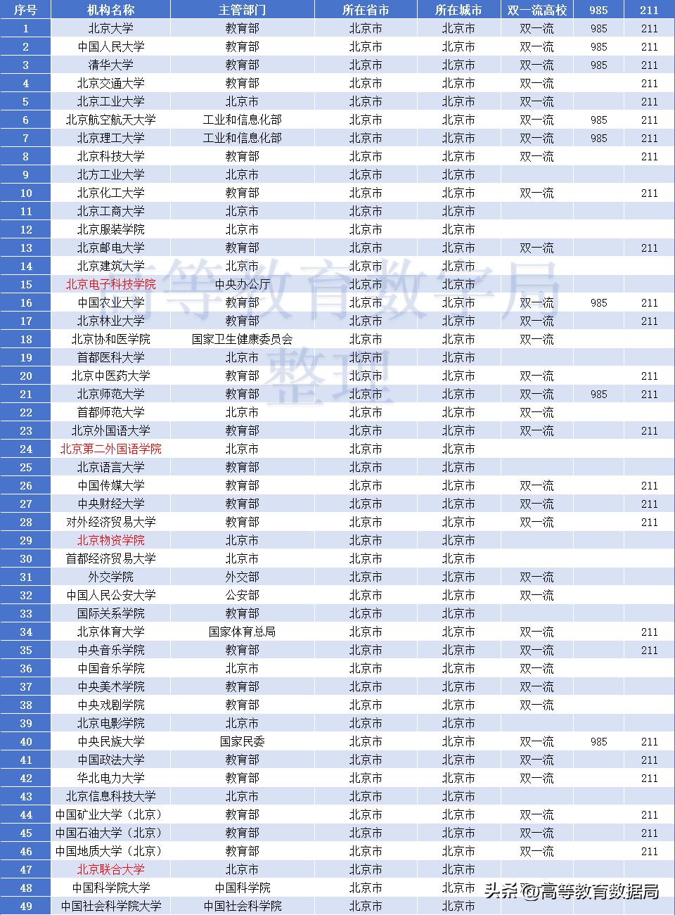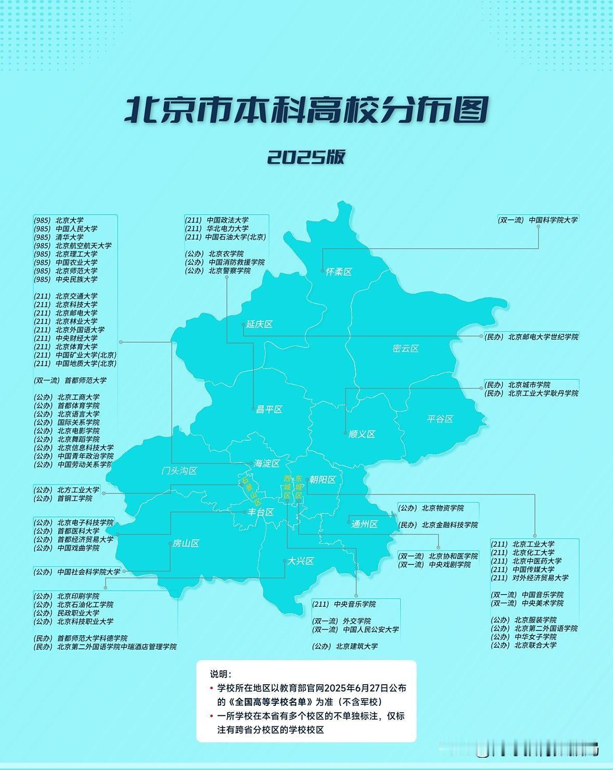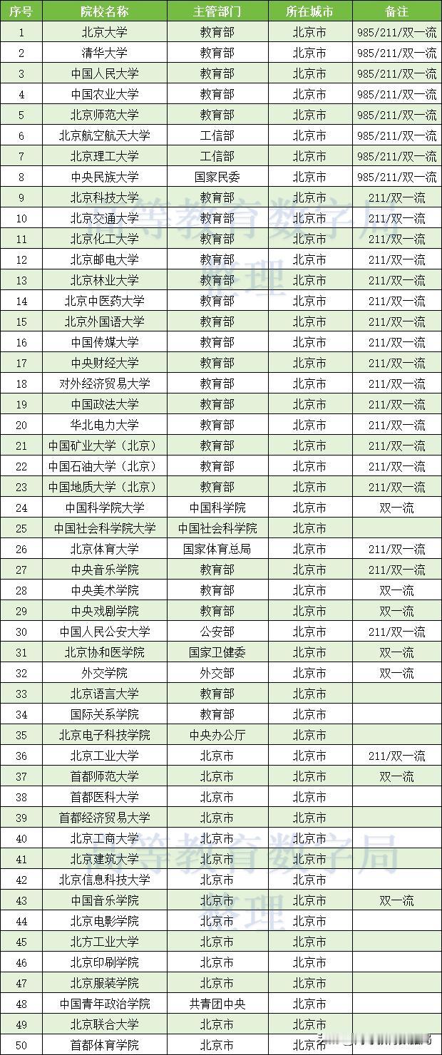 截至2025年底,北京共有全日制本专科院校92所,其中,本科高校就有69所,包括63所公办本科高校,而这其中有多达40所是各部委直属的本科高校,享受着各大部委最好的资源和政策倾斜。 北京现在已经有50所大学是博士学位授予单位,另有9所大学是硕士学位授予单位,这还不包括在北京的各大科研院所和军事院校。这已经造就了北京市硕士和博士毕业生超过了本专科毕业生这样的倒挂现象。大量京外非核心城市高校想招个博士很难很难,但北京的各大中学已经充斥了大量的985博士毕业生。 北京原本已经有45所本科院校具有推荐研究生免试资格,竟然在2024年又新增了4所,分别是:北京电子科技学院、北京联合大学、北京物资学院、北京第二外国语学院。北京一座城市的保研大学数量已经超过了全国的十分之一,北京的高等教育资源过剩与其他省份的资源不足,形成强烈对比,是不是应该剥离一些,避免过度不均衡? 北京高校 北京高校研究生