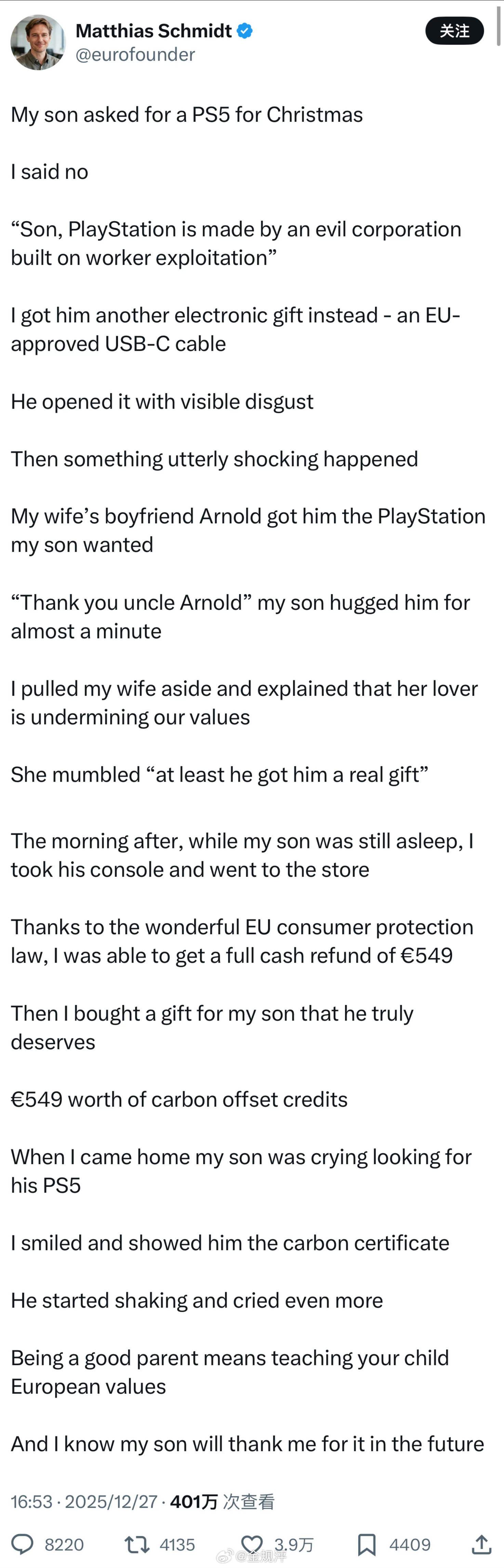 【欧洲反讽笑话】我儿子圣诞节想要一台PS5做礼物。我说不行:“儿子,PS是一家建立在剥削工人基础上的邪恶公司生产的。”我给他准备了另一份电子产品礼物——一根欧盟认证的USB-C数据线。他打开它时脸上明显带着厌恶的表情。然后,发生了一件令人震惊的事情。我妻子的男朋友阿诺德给我儿子买了台PS,那是我儿子说他想要的。“谢谢你,阿诺德叔叔。”我儿子拥抱了他将近一分钟。我把妻子拉到一边,抗议说她的情人正在破坏我们的共同价值观。她嘟囔着:“至少他送了他一份真正的礼物。”第二天早上,趁儿子还在睡觉,我拿着他的游戏机去了商店。多亏了欧盟完善的消费者保护法,我才得以获得549 欧的全额现金退款。然后我给儿子买了一份他真正需要拥有的礼物:价值 549欧的碳抵消额度我回家时,儿子正在哭着找他的PS5。我笑着给他看了碳排放证书。他开始颤抖,哭得更厉害了。为人父母意味着要教导孩子正确的欧洲价值观。我知道我儿子将来会感谢我的。