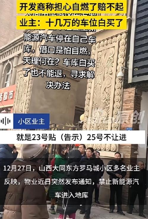大同一小区新能源车禁入地库,十几万车位白买,一句赔不起还不给退钱,业主的权益该如何保障! “花十几万买的专属车位,每月按时交管理费,凭啥突然不让新能源车进?”近日,山西大同东方罗马城小区的一纸禁令,让数十位新能源车主陷入两难。物业以“消除消防安全隐患”为由禁止新能源车驶入地库,开发商直言“怕自燃了赔不起”,而业主们花十几万车位又怎么算? 12月23日小区张贴的一则通知,明确自12月25日起,地下车库全面禁止所有新能源车辆进入,仅以“保障业主生命和财产安全”为由简单带过 。这则仅预留两天缓冲期的禁令,瞬间引发业主强烈不满。据业主反映,小区不少车位是购房时花费十余万元购入的专有产权车位,即便没有产权,业主也通过租赁或购买使用权获得了停放资格,且每月都会按时缴纳120元车位管理费 。 如今寒冬腊月,被禁止入地库的新能源车主只能将车停在路边或周边小区,不仅面临贴条、被盗风险,低温还会严重影响车辆续航和电池寿命。面对业主质疑,开发商给出的回应直白又无奈:“新能源车万一自燃,引发连环事故我们赔不起”。 更让业主气愤的是,既然不让停在自己的车位里,那么物业就应该提供替代停放方案,但是该物业公司不仅没有方案,更是拒绝退还车位费或管理费。这简直就是霸王条款!小区的业主们目前是买了车位用不了,想退车位还退不成。 目前,相关部门正在组织业主、物业和开发商协商解决方案,但尚未达成一致意见。新能源汽车推广是大势所趋,物业和开发商理应通过完善配套设施、升级消防系统、划定专用停放区等合规方式规避风险,而不是以“赔不起”为由将责任转嫁给业主。难道业主就该哑巴吃黄连,做这个冤大头?对此你有什么想说的?
