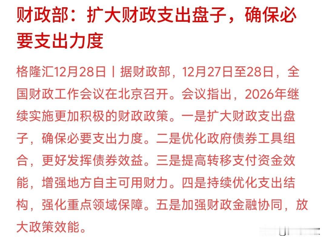 周末重大利好来了,明年资本市场的流动性将会增强,居民手里的钱也会增加 明年国家已经明确规定了会扩大财政支出,主要就是两个方面 1.扩大财政总支出规模,保障民生、新质生产力、基建等关键领域的必要投入;这个方面就是让居民手里面有钱,通过基建这些方面,把钱送到居民手里。 2.会把政府债券,比如专项债、超长期特别国债用得更灵活,让每笔钱都花在刀刃上,既拉动经济又避免浪费。这部分钱就是为了资本市场的流动性,让资本市场有足够的资金。 可以说明年将会是财政关键的一年,有催进消费的压力,也有提高居民收入的压力。
