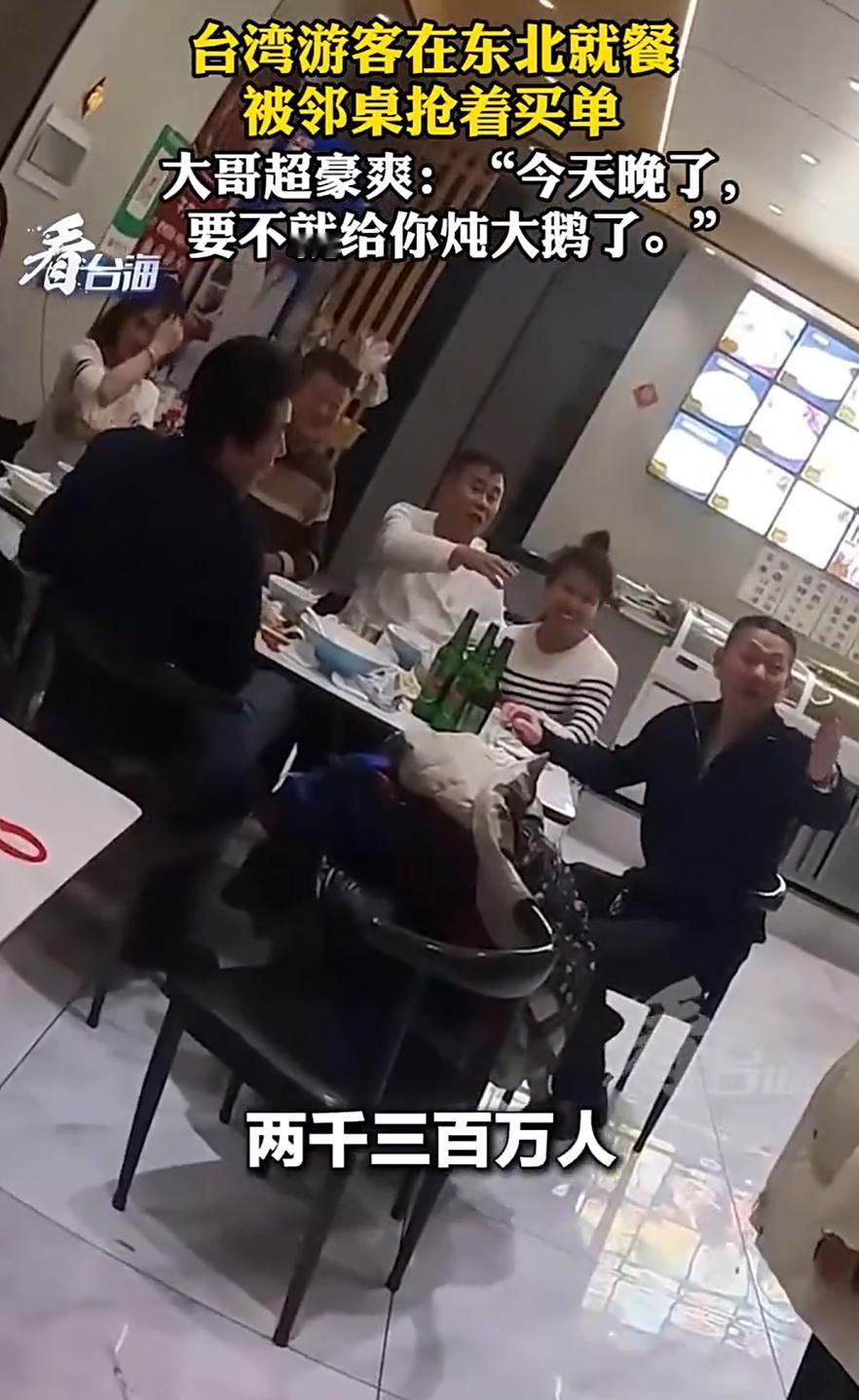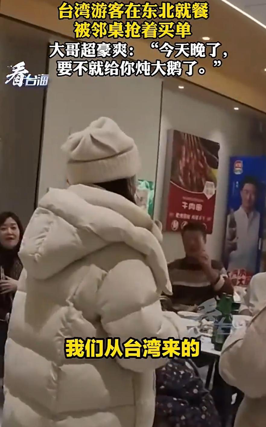 格局打开了!两名台湾女生到哈尔滨旅游,在餐厅吃晚饭准备买单时,却被老板告知:你们这桌都算完了!她们这才知道,原来单子被邻桌几位大哥大姐给买了,在表达感谢时,一位大哥表示:两岸一家亲,回祖国,天天拥抱你们! 一开始,两名女生听到自己单子已经被人买过了,她们也很惊讶,想着老板是不是看错桌子了,但老板笑了笑说没错,然后指着一桌的东北大哥大姐,说他们刚才已经给你们买过了 两人连忙上前感谢,说自己是从台湾来的,但在坐的大哥大姐们却一点不意外,因为刚才买单前,就已经听出他们说话的口音了解到了,所以才会主动买单 其中一位大哥也是代表发言说:在东北你们好好玩,东北人就是这么热情,今天半夜没办法,要不就炖大鹅了,两千三百万人回祖国啊,两岸一家亲 两名女生听到后,也是连连道谢,表示这份热情她们全都看到了 说实话,这种事发生在东北真不意外,但听到还是觉得心里一暖。东北人的热情从来不是嘴上说说,而是实实在在做出来的。他们可能不会讲什么漂亮话,但那种直爽和坦诚,反而让人觉得特别踏实 而且值得一提的是,他们在买单后没有张扬,也没有刻意去让谁知道,更没有站出来等着被感谢。就是结完账,继续吃饭聊天,好像这件事本来就不值得单独拿出来说。要不是女生去结账,这件事可能就这么过去了 我觉得,两名女生出门在外,遇到这样的温暖,大概会记很久吧