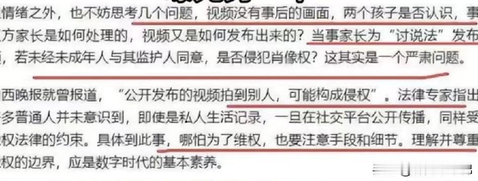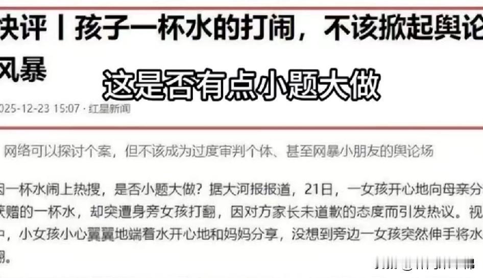 一杯水引发的一场大闹剧,经历了“发酵—网暴—道歉—端水方被网暴—删除视频”,最后终于落下帷幕! 原本是女孩妈妈想要记录女儿第一次独立向服务员要水的过程,没想到会被另一个女孩无故打掉手里的水杯。而对方一句道歉没有,转身就走了,女孩怔了几秒后,开始嚎啕大哭。 这个只有几秒的视频被发上网后,没想到舆论快速发酵,拍人女孩被网友定性为“天生坏种”,指责其家长和孩子都没有素质。风波一度扩大到不可控的程度,对方家庭住址,父母工作单位等等被网友一一扒出。这是针对始作俑者一方的第一波网暴! 同时端水女孩妈妈也报了警,只希望女儿能得到对方的一句道歉。帽子叔叔找到对方家长协调沟通,迫于舆论压力,对方家长向女孩儿道了歉。本以为事情到这里就结束了,没想到竟然极速反转! 有网友开始质疑视频不给孩子打码,侵犯了未成年人肖像权,一次的行为不能给未成年人定性。就连红星新闻都发文称端水女孩家长“小题大做”,哪怕为了维权,也要注意手段和细节,一个孩子不应该被放到网上任人评判。 这本是生活中再小不过的一件事,放到网上就像是加了一把放大镜,双方言行细节被逐一放大。 端水女孩本来是受了委屈的一方,网友的同情怜惜,夹杂着对另一个女孩和家长的指责批评,铺天盖地而来。但是故事的最后没有赢家,舆论像一把回旋镖,扎完一方又扎另一方。相信这件事能让两个孩子记忆深刻!也给家长们该如何教育好自己的孩子敲响了警钟!