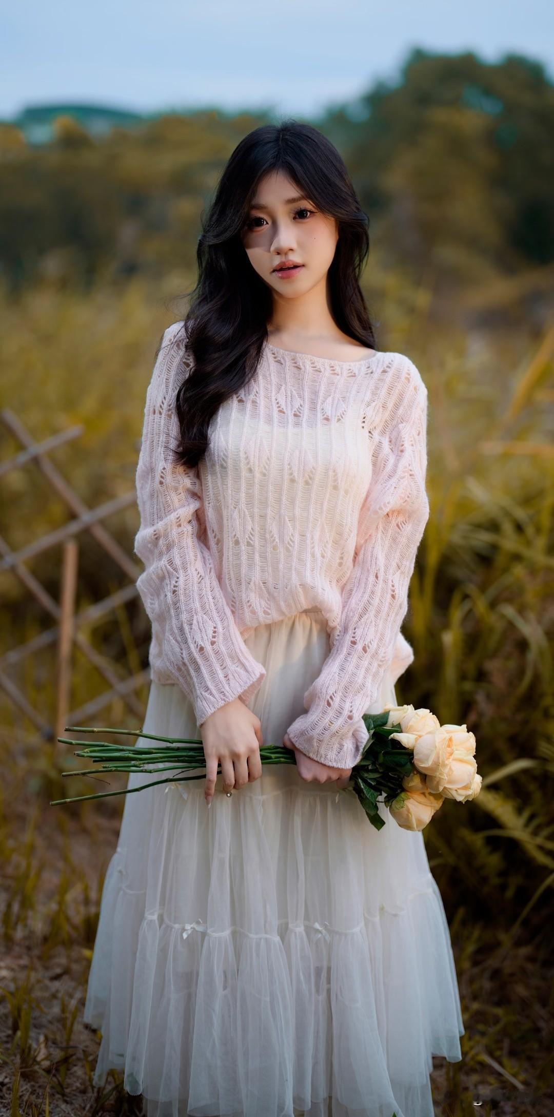 梦幻田野中的少女,手持玫瑰,唯美浪漫。