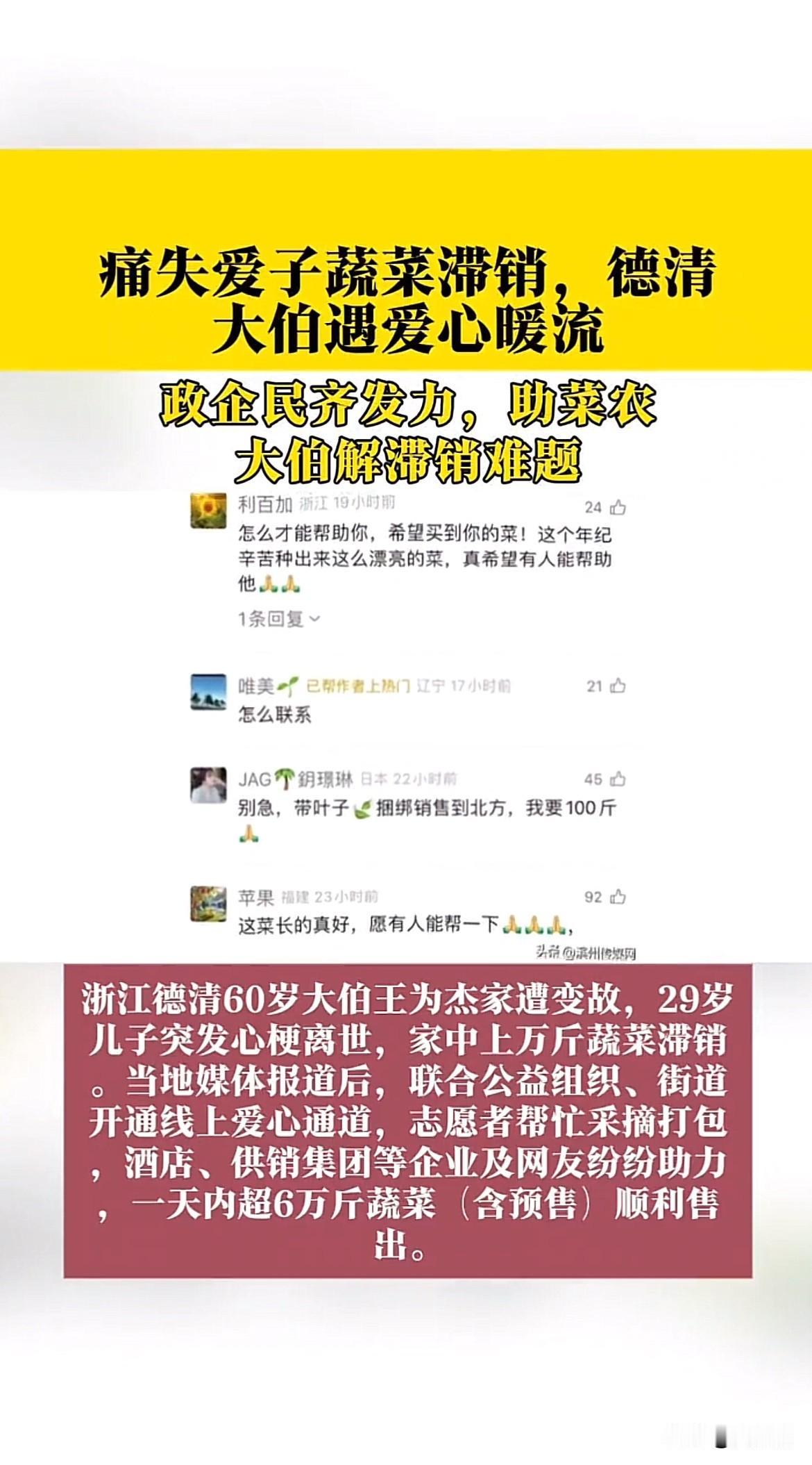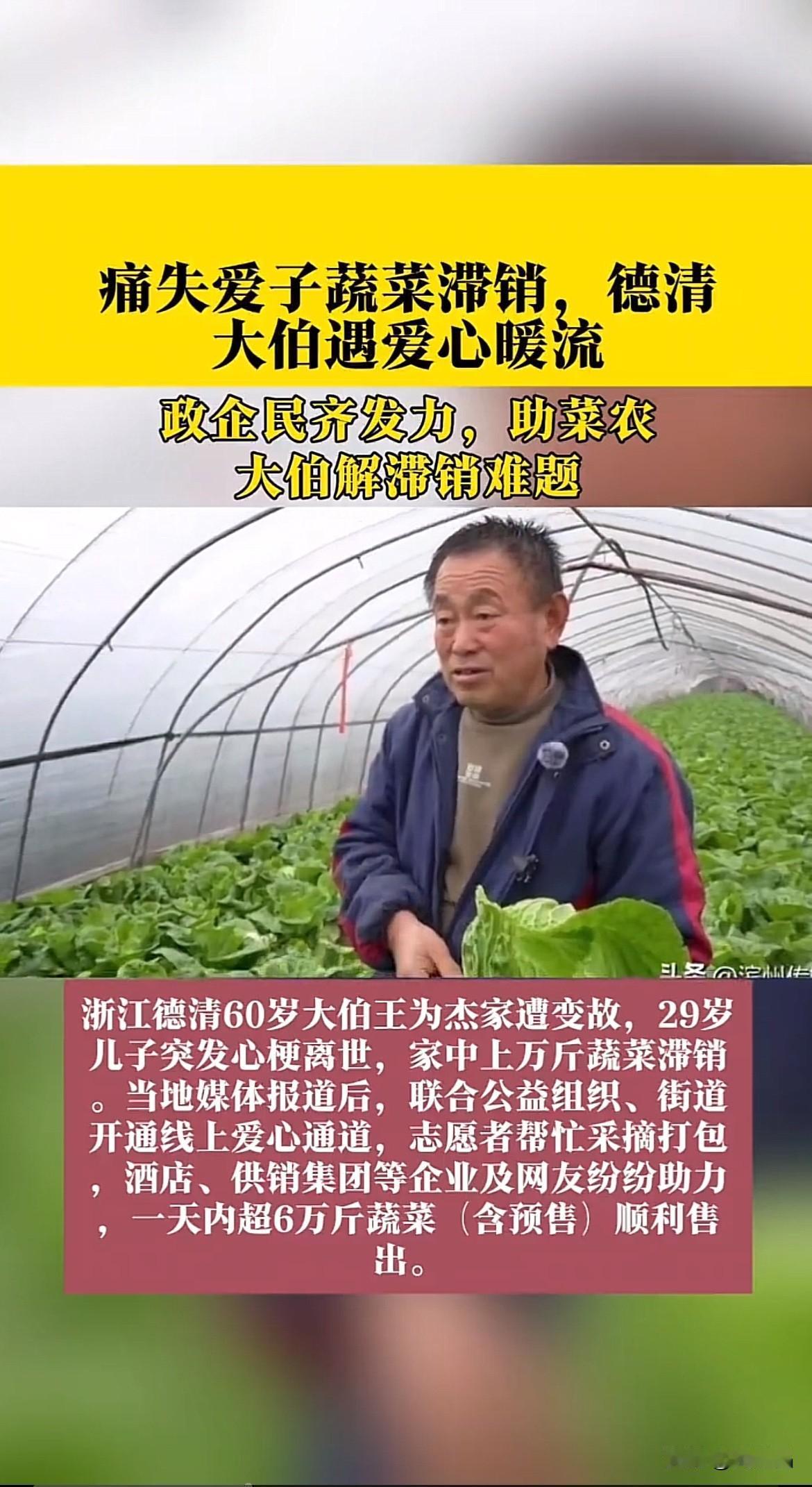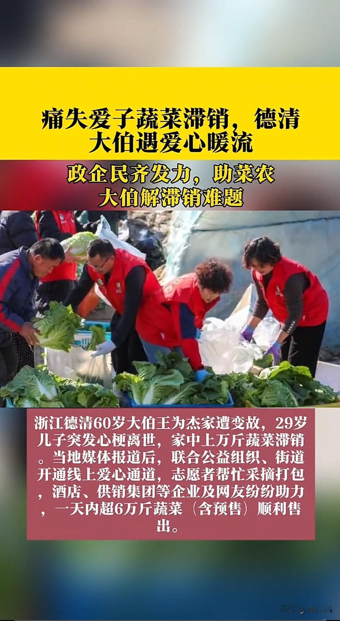 一方有难八方支援!浙江,29岁儿子突发心梗离世,一家老小没了顶梁柱,家中上万斤蔬菜滞销,本以为烂在地里了,没想到来自四面八方的好心人士解了燃眉之急。 儿子突然走了,留下两个幼儿,家里还有做过心脏手术不能干重活的老母亲,60岁老父亲王大伯挑起家里大梁。 可王大伯在农贸市场一天只能卖100多斤,往年儿子运往杭州余杭等地,一天能卖4、500斤,家里40多亩,一万多斤的蔬菜滞销,全靠王大伯一人采摘、销售,怕是要烂在地里了。 当地媒体得知王大伯遭遇,报道在网上,网友们纷纷发来爱心帮忙,线上争先购买,线下酒店和供应集团也来助力,预定大量蔬菜,献出自己的一份力。 公益组织和村干部组成一支志愿队,帮忙采摘、分装、打包,仅仅一天就卖出60000斤蔬菜。 王大伯说:“虽然大家是来帮我们的,但质量一定要保证,不能让任何一颗有问题的蔬菜从我们这里流出去,” 看哭了!四面八方的爱心,让这个遭受厄运的家庭,充满了温暖和爱,重新燃起生的希望。 人间有真爱,好人一生平安,为善良之人点赞👍
