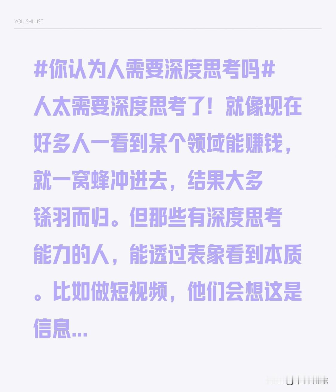 人太需要深度思考了!就像现在好多人一看到某个领域能赚钱,就一窝蜂冲进去,结果大多铩羽而归。但那些有深度思考能力的人,能透过表象看到本质。比如做短视频,他们会想这是信息载体,不同定位属性不同。深度思考能让我们在复杂世界中找到方向,不盲目跟风,这才是成事的关键。